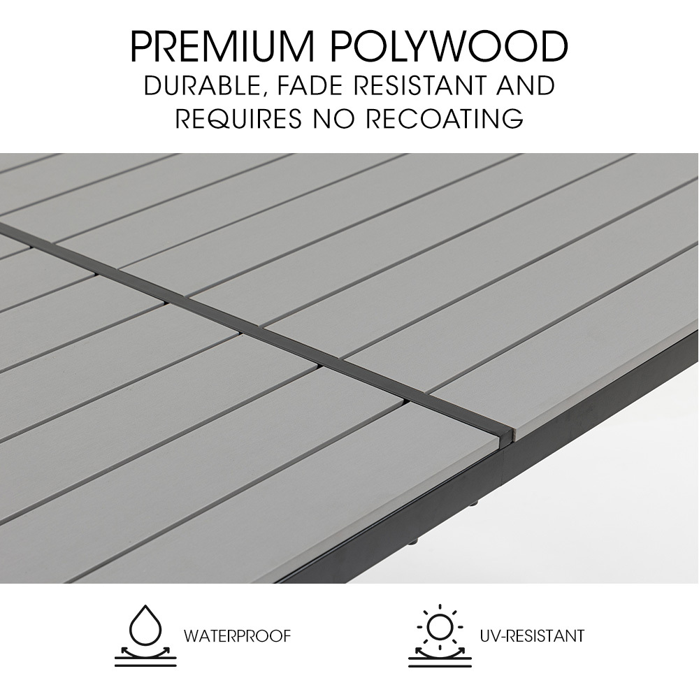 - Premium natural-looking polywood tabletop that requires no upkeep