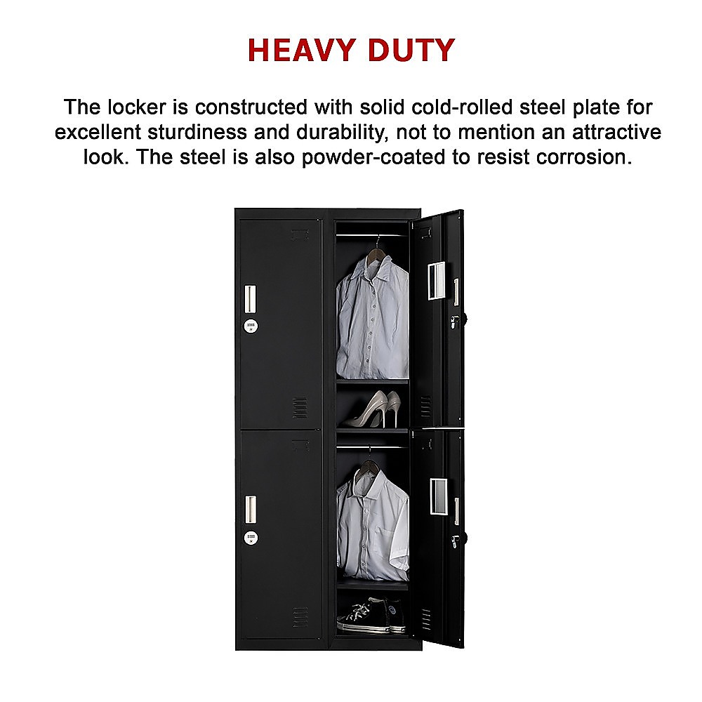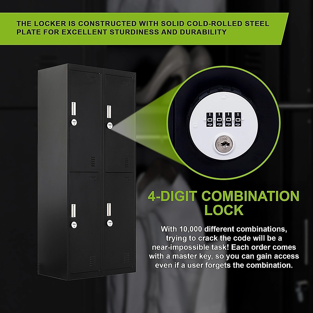This four-door office gym shed storage locker provides a practical and secure solution for storing personal belongings in various settings such as gyms, schools, and workplaces. It features four spacious lockers arranged in a compact 2 x 2 grid, offering ample space for clothes, valuables, and other items. Constructed from durable cold-rolled steel and finished with a corrosion-resistant powder coating, the locker combines sturdiness with an attractive appearance. Built-in ventilation and designated label spaces enhance usability, while a simple lock and key system ensures privacy and security.