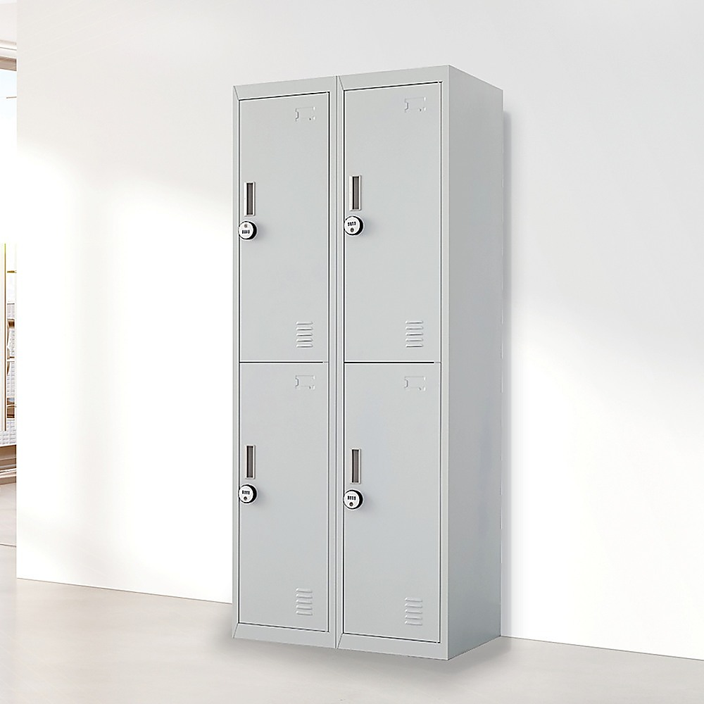 This four-door office gym shed storage locker provides a practical and secure solution for storing personal belongings in various settings such as gyms, schools, and workplaces. It features four spacious compartments arranged in a compact 2 x 2 grid, suitable for storing clothes, valuables, and other items. Constructed from durable cold-rolled steel and finished with a corrosion-resistant powder coating, the locker combines sturdiness with an attractive appearance. Ventilation is ensured through built-in air vents, and privacy is maintained with a simple lock and key system. The locker is designed for easy assembly and can be combined with additional units for increased storage capacity.