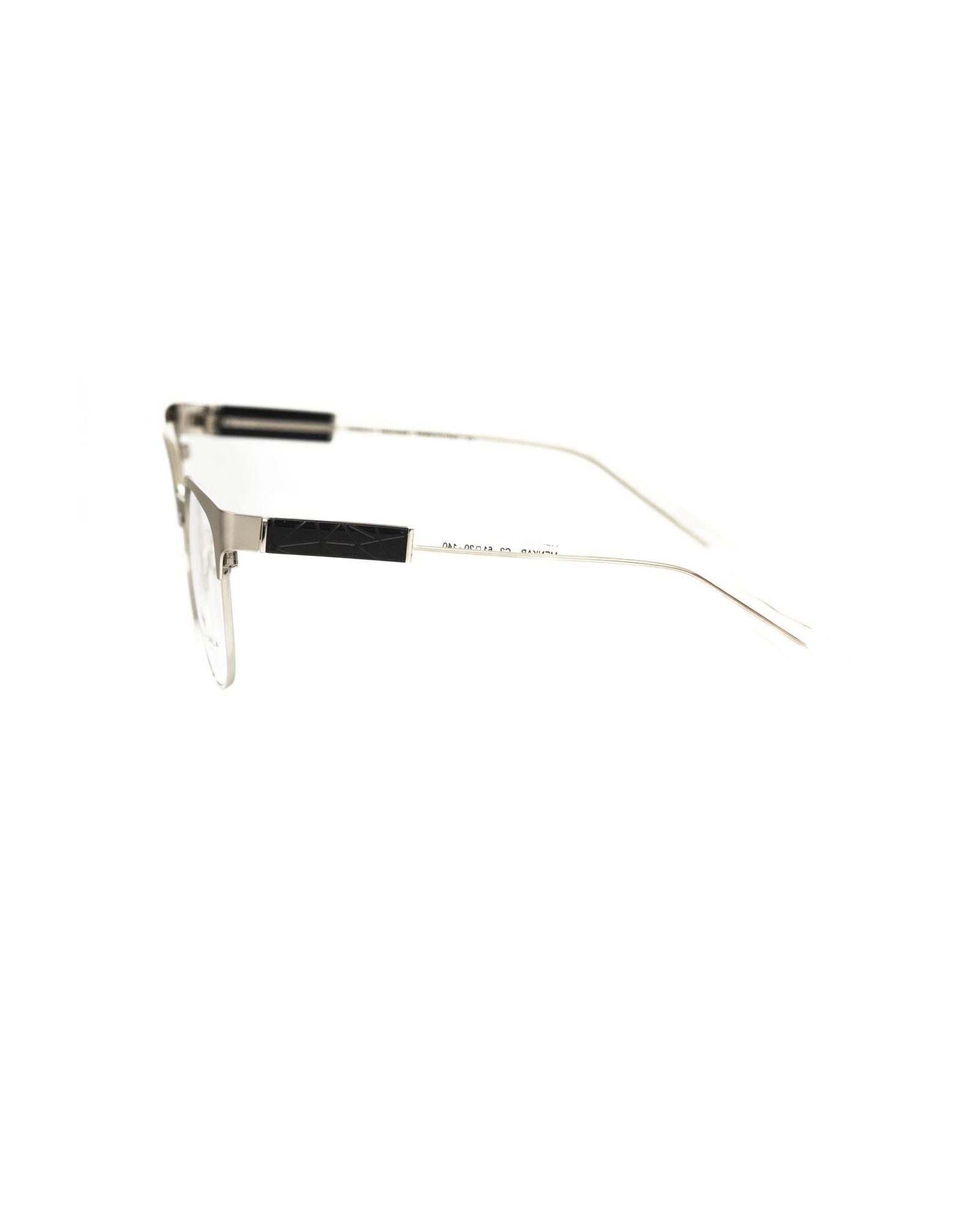 This pair of women’s eyeglasses features a striking black design with a unique geometric and transparent pattern, combining style and durability. Crafted from high-quality acetate and metallic fiber, these glasses offer a fashionable and long-lasting accessory with an Italian design flair.