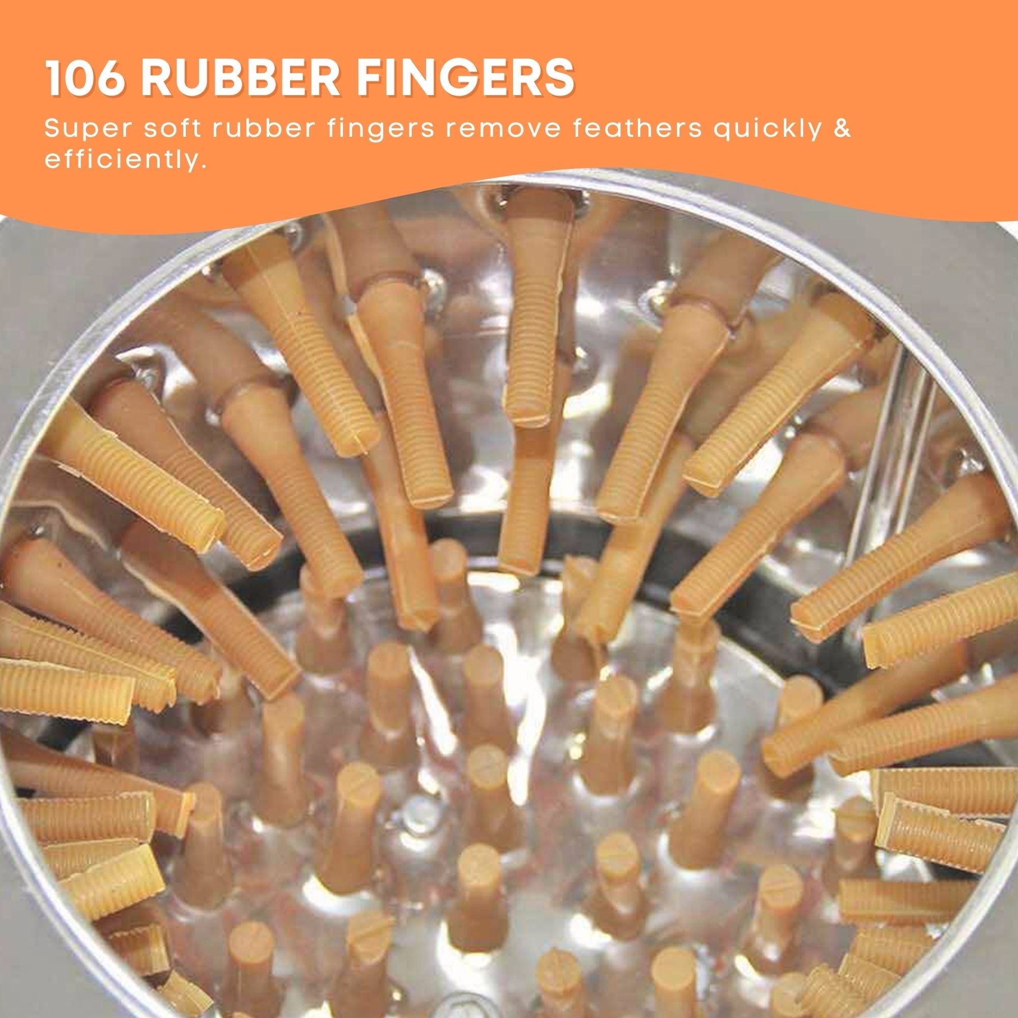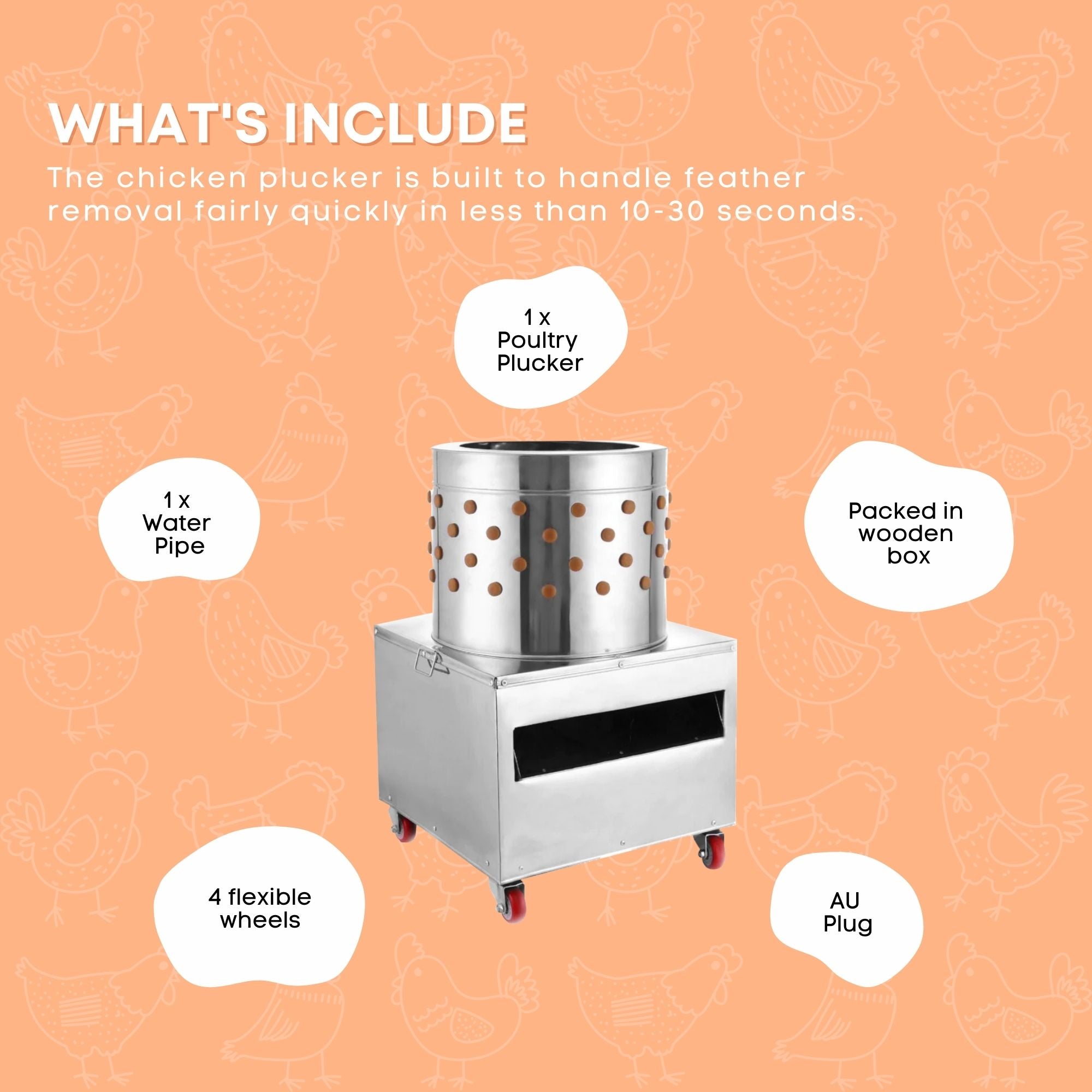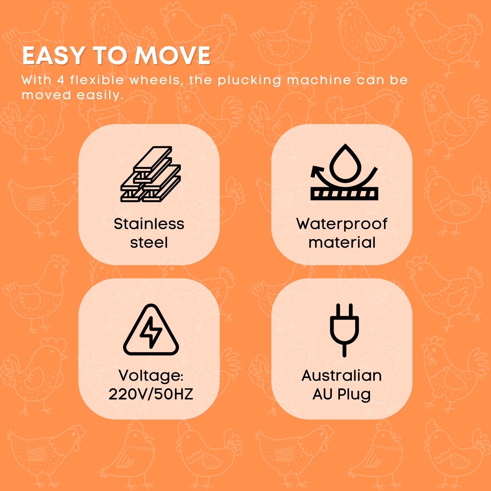 This electric poultry plucker features a durable stainless steel tub with a diameter of 50cm, designed to make feather removal quick and efficient. It can handle multiple birds at once, making it suitable for small to medium-sized poultry such as chickens, ducks, turkeys, and geese. The machine is mobile with four wheels and includes a garden hose attachment for easy operation, allowing you to pluck birds in under a minute.