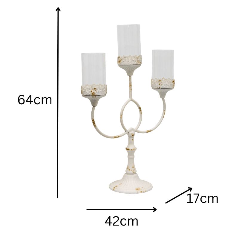 This elegant 3-pillar candelabra centerpiece features a vintage-inspired design, making it a charming addition to your home or garden decor. Its antique appearance adds a touch of sophistication and warmth to any setting.
