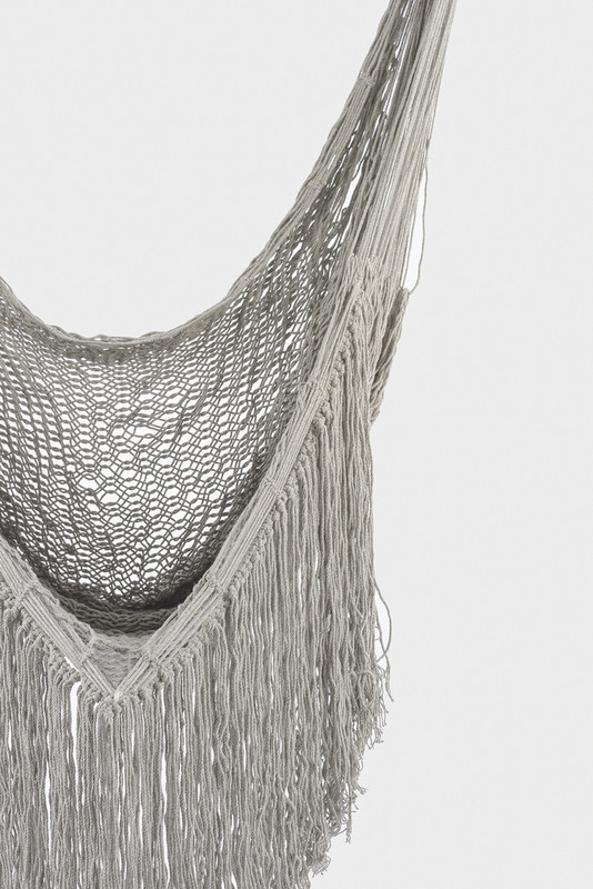 This hammock swing is crafted from 100% cotton rope in a stylish gray color, featuring a luxurious fringe detail. It is designed for comfort and aesthetic appeal, making it suitable for indoor or outdoor relaxation spaces.