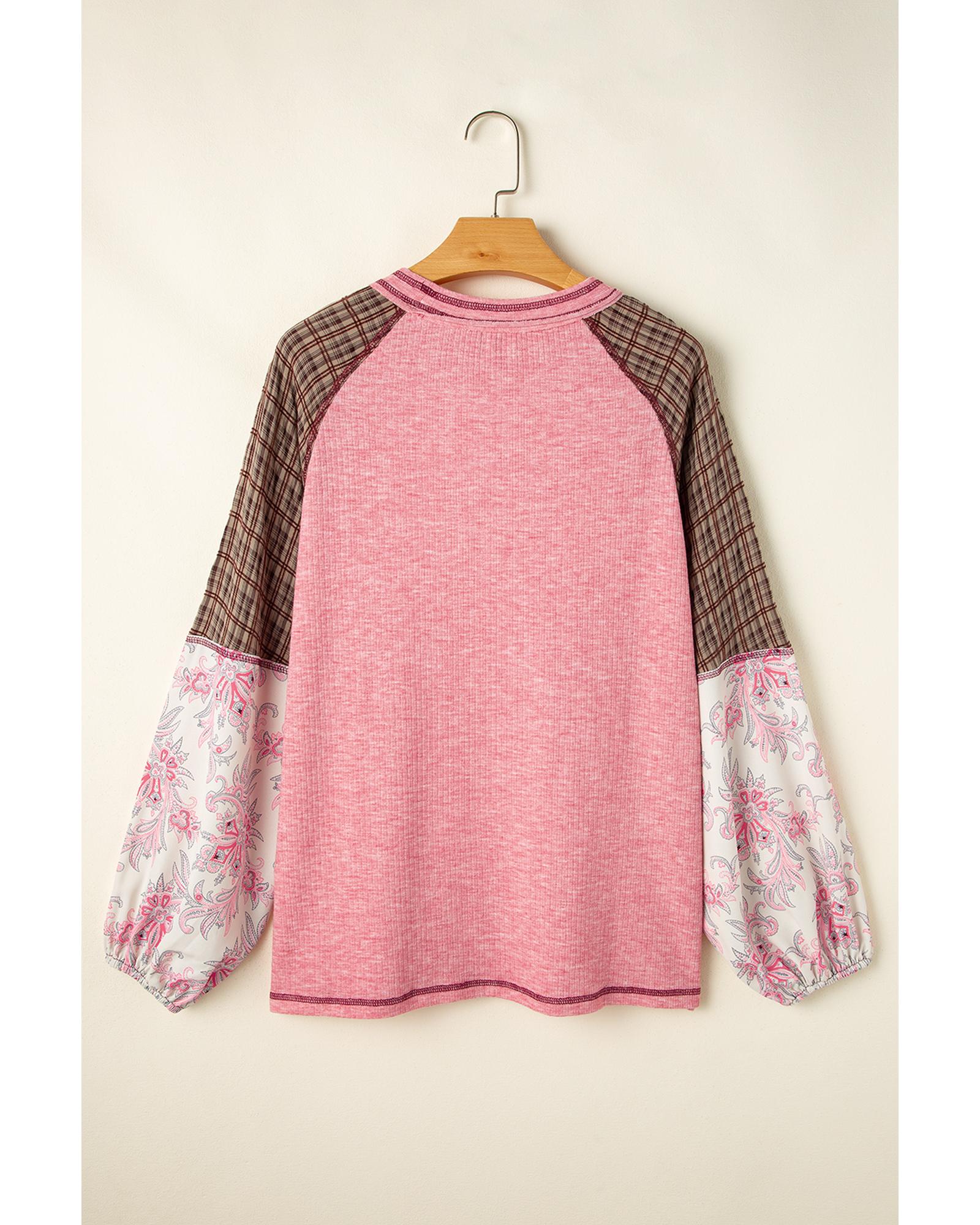 Fushia Mixed Print Raglan Sleeve Ribbed Knit Patchwork Blouse – L