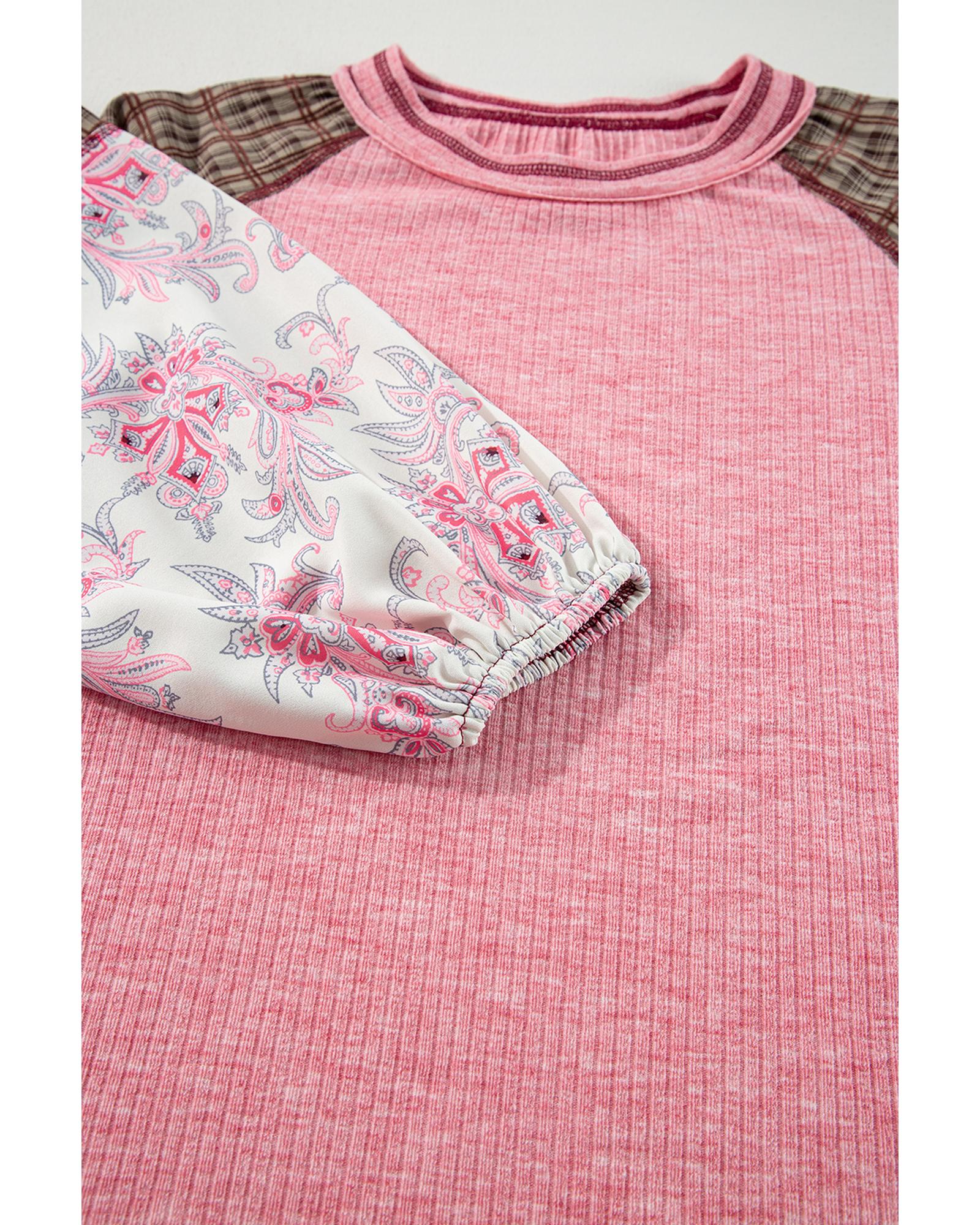 Fushia Mixed Print Raglan Sleeve Ribbed Knit Patchwork Blouse – M