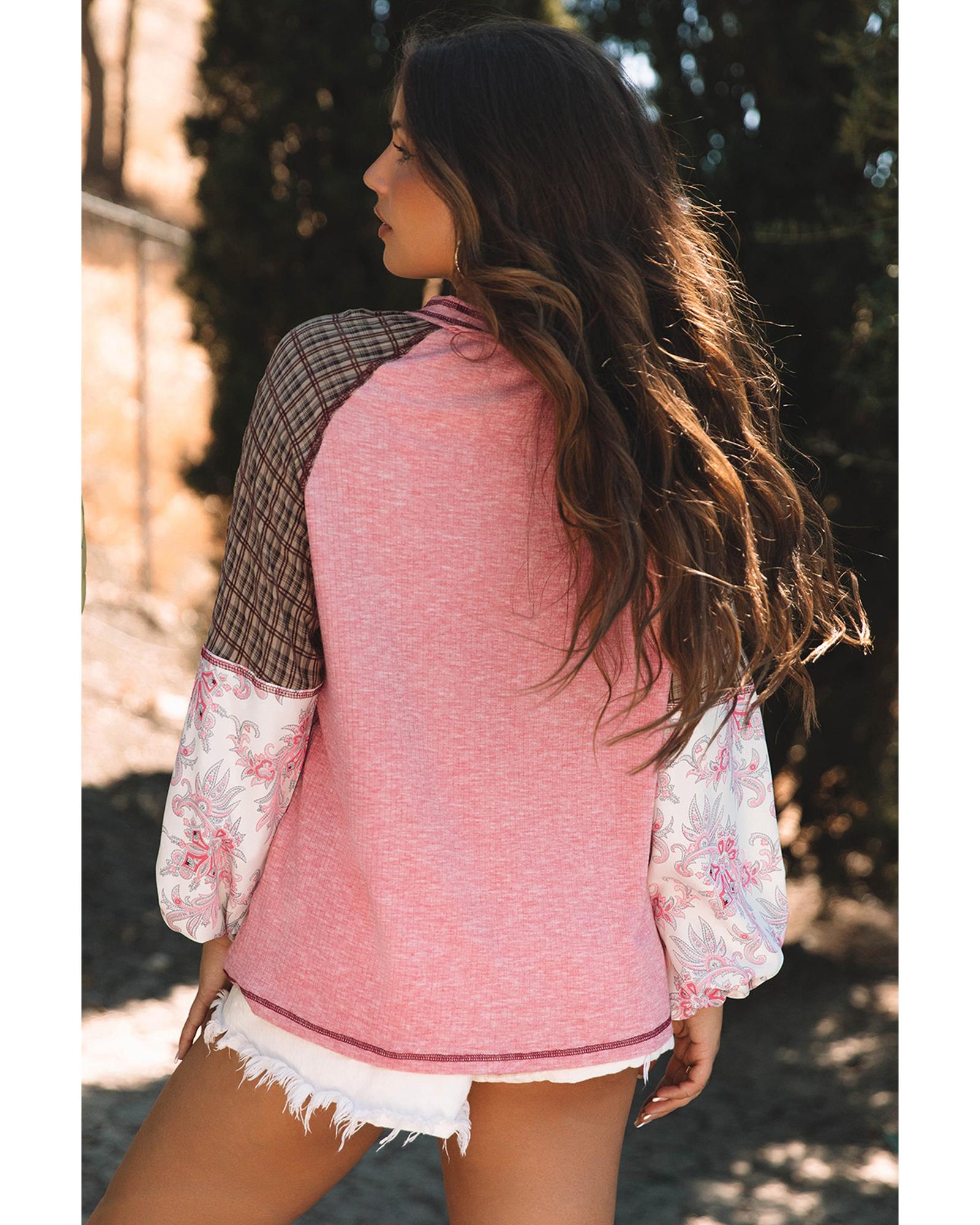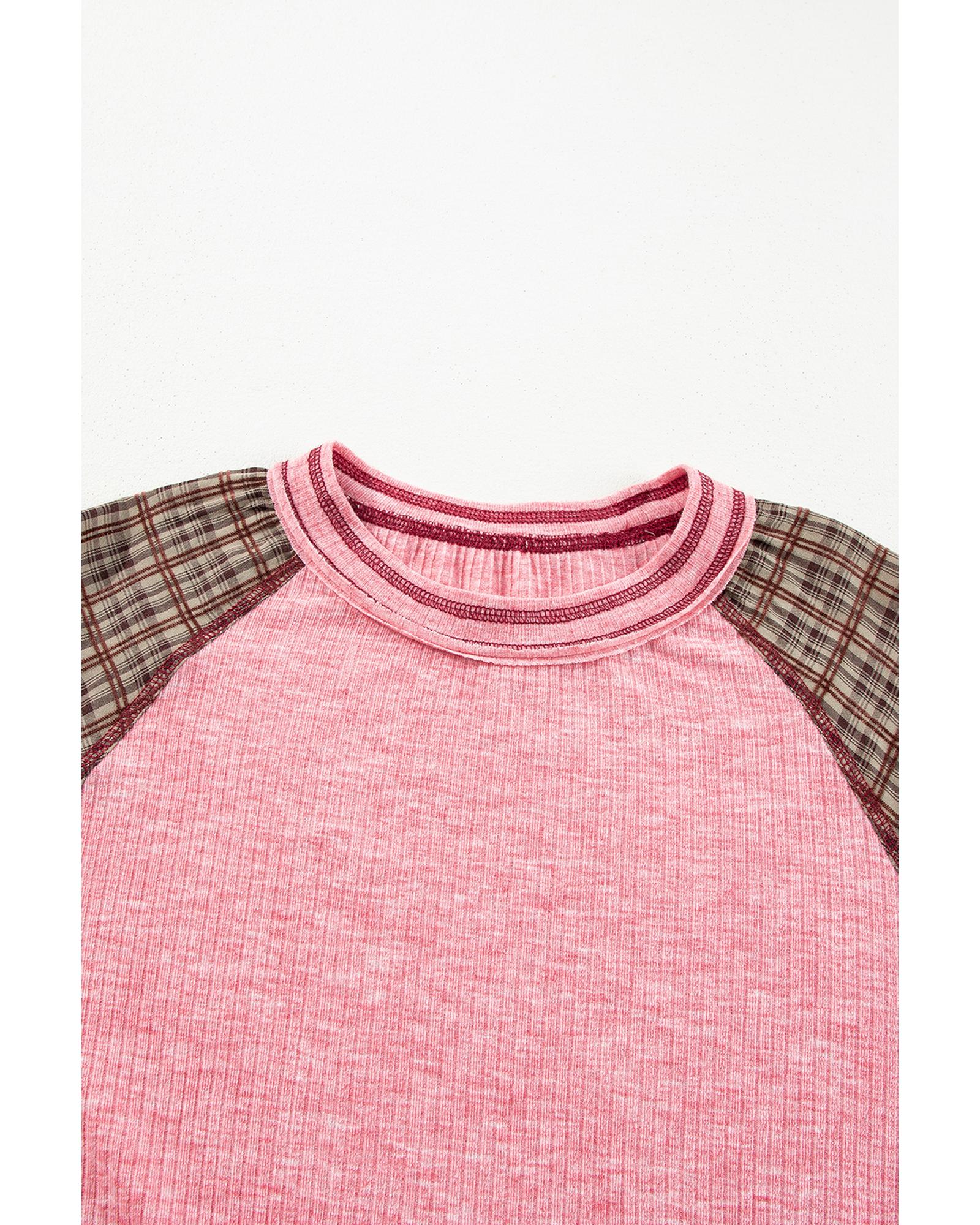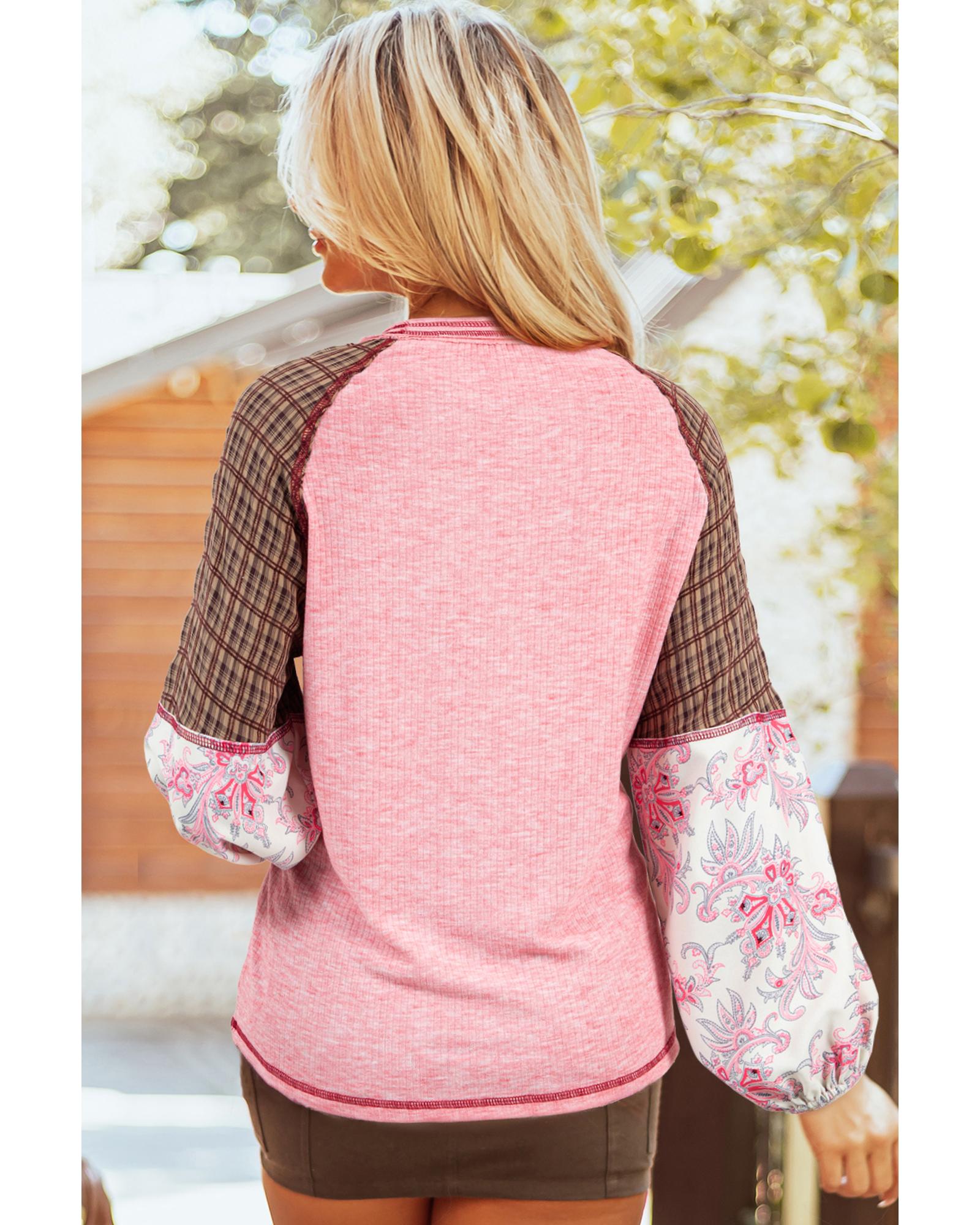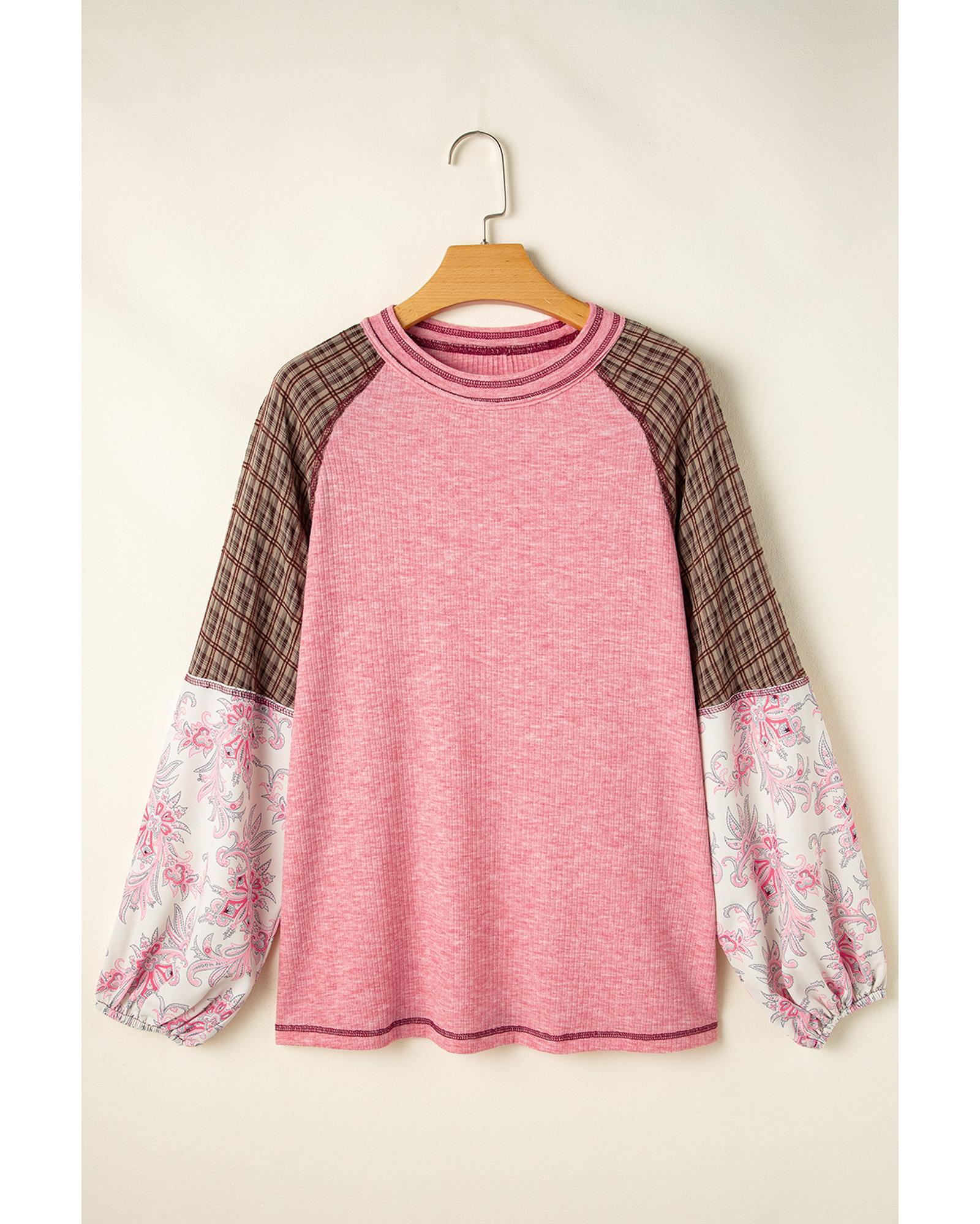 This stylish blouse features a trendy fitted look with unique mixed print bubble sleeves, perfect for a chic and casual outfit. Made from cozy and breathable ribbed fabric, it showcases an elegant patchwork design and raglan sleeves, making it a versatile addition to your wardrobe.