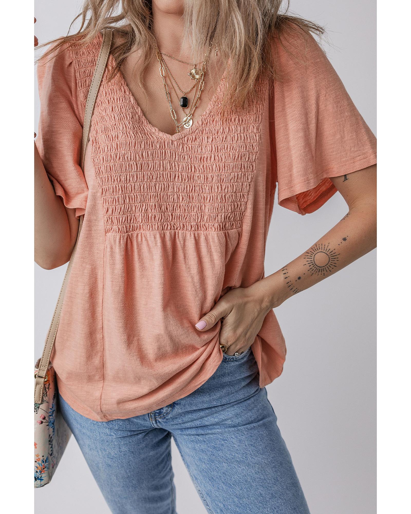 This stylish babydoll top features a smocked front design and a V neckline, combining comfort with feminine charm. The pleated details add a flattering silhouette, making it a versatile addition to your wardrobe. Designed with short sleeves, it offers an airy and comfortable fit suitable for various occasions.