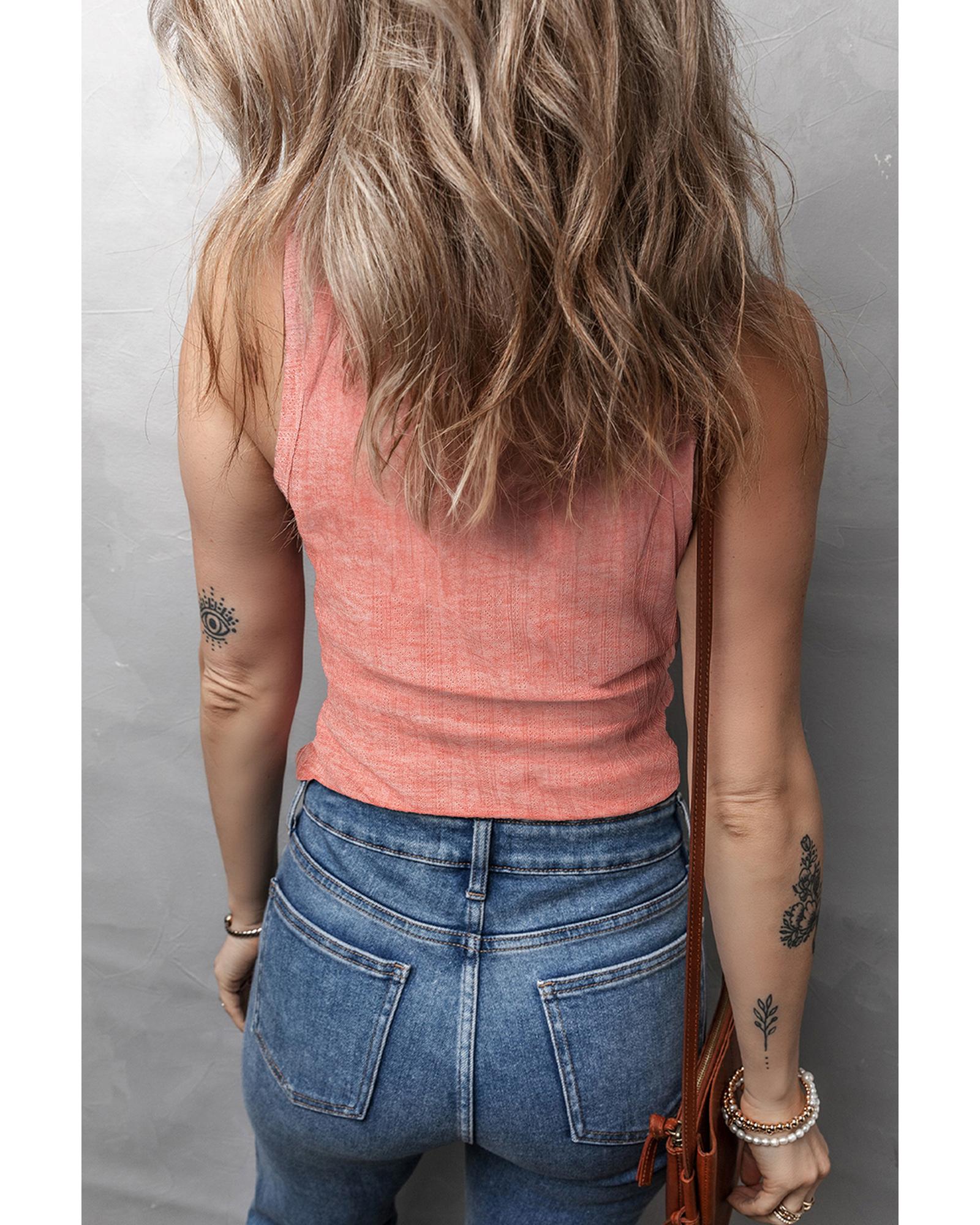 This solid color textured tank top features a stylish U neckline that highlights the collarbone. Made from a comfortable, high-elasticity fabric, it offers a slim fit suitable for various outfits. The textured material adds visual and tactile interest, making it a versatile addition to your wardrobe.