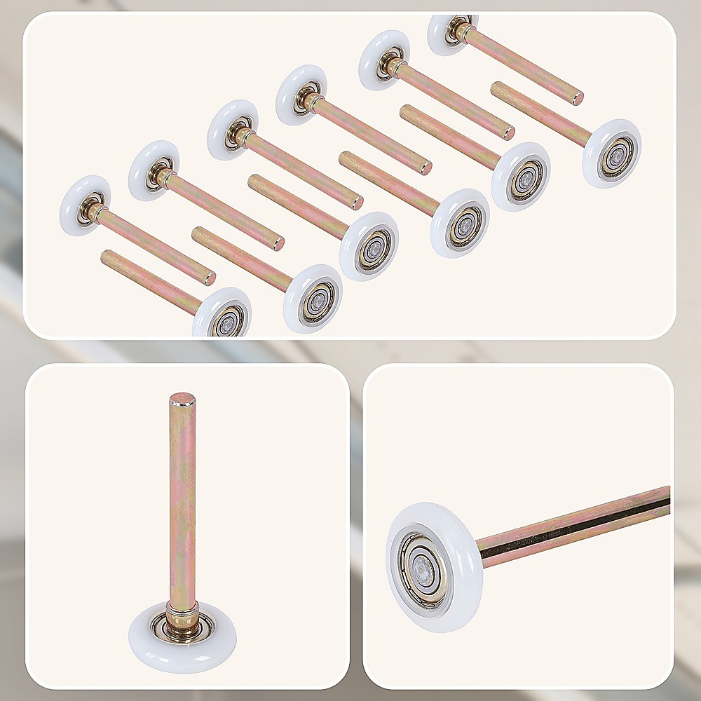 This set includes twelve heavy-duty garage door rollers designed to reduce noise and improve operation. Each roller features 13 ball bearings and a lubrication groove for long-term smooth performance. The rollers are compatible with most standard garage doors and are built to last with durable materials and pressed construction.