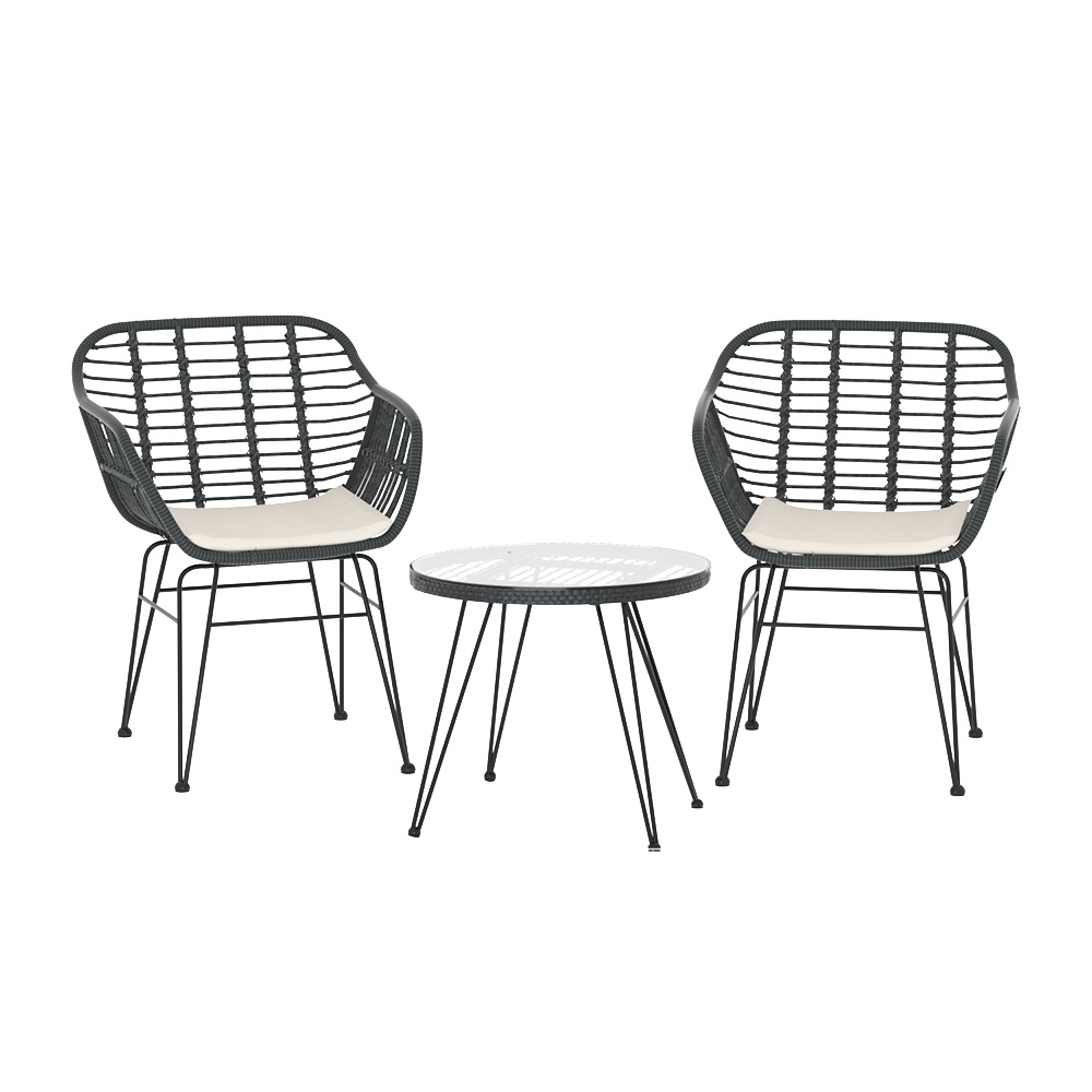 This outdoor furniture bistro set is designed for relaxing and entertaining outdoors. It includes two stylish chairs and a matching coffee table, providing a comfortable and functional space for outdoor gatherings. The set is easy to assemble and can be configured to suit your outdoor layout. The chairs feature a sturdy steel frame covered with handcrafted PE wicker, and the cushions have water-resistant and UV-resistant covers. The tempered glass tabletop adds elegance and durability, offering ample space for outdoor essentials. Maintenance involves simple wiping, and cushion covers can be removed for easy cleaning.