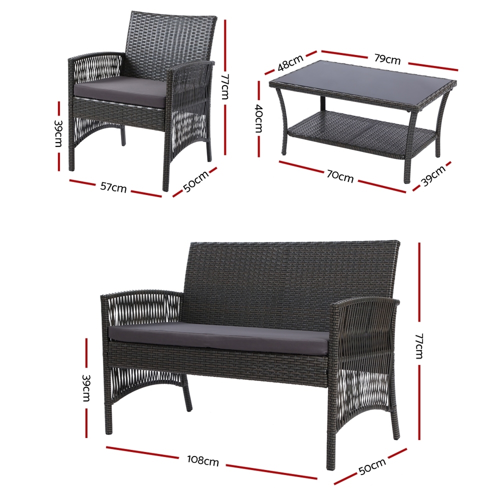Gardeon 4PCS Outdoor Sofa Set Wicker Harp Chair Table Garden Furniture Grey