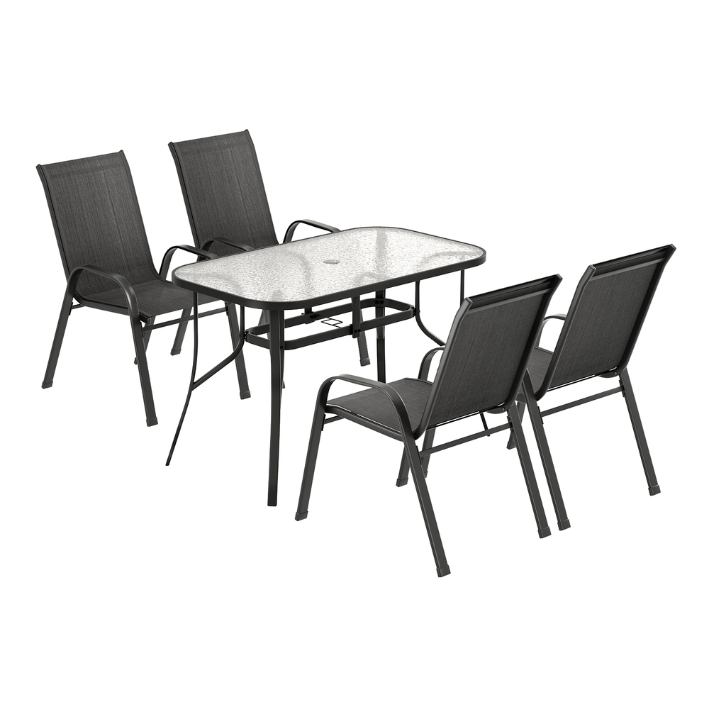 This outdoor dining set includes a spacious table and four stackable chairs, designed for outdoor and indoor use. The rust-proof steel frame and all-weather fabric ensure durability and vibrant colors over time. The table features a tempered glass surface with a built-in parasol hole, while the chairs are equipped with floor protectors for stability and surface safety. Its sleek and versatile design makes it suitable for various settings, providing a comfortable space for outdoor meals and gatherings.