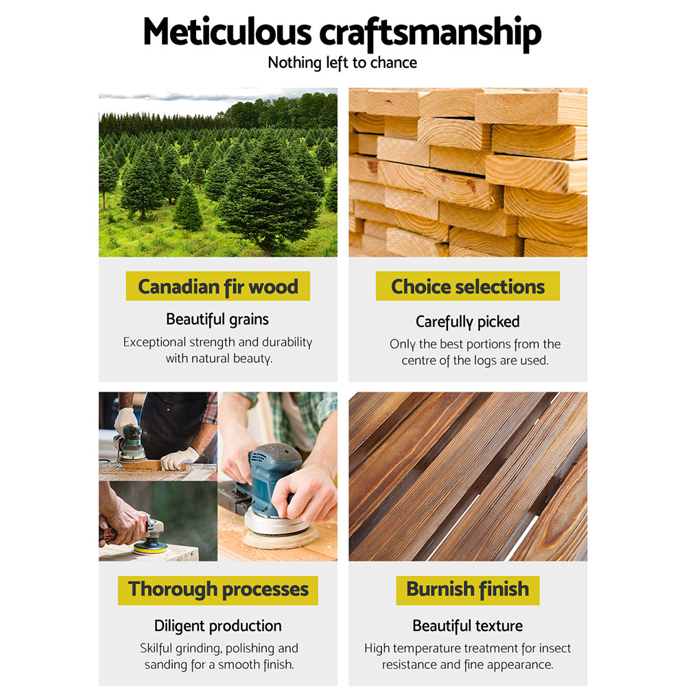 Material: Fir wood with a burnt finish, treated through carbonization. Overall dimensions are approximately 86 x 72 x 80 centimeters. The product requires assembly upon delivery. It is packaged with two units per box.