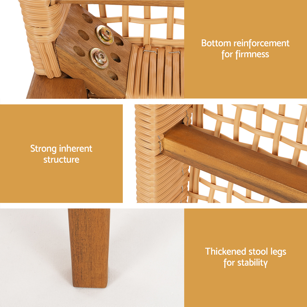 This outdoor garden bench seat is designed for two people, providing a comfortable and stylish addition to your outdoor or indoor space. Crafted with a smooth rubber wood surface and a PE wicker seat, it combines durability with a classic aesthetic. The weather-resistant construction ensures it remains sturdy and attractive in various weather conditions. Its reinforced bottom and thickened legs support a high weight capacity, making it suitable for everyday use and outdoor gatherings.