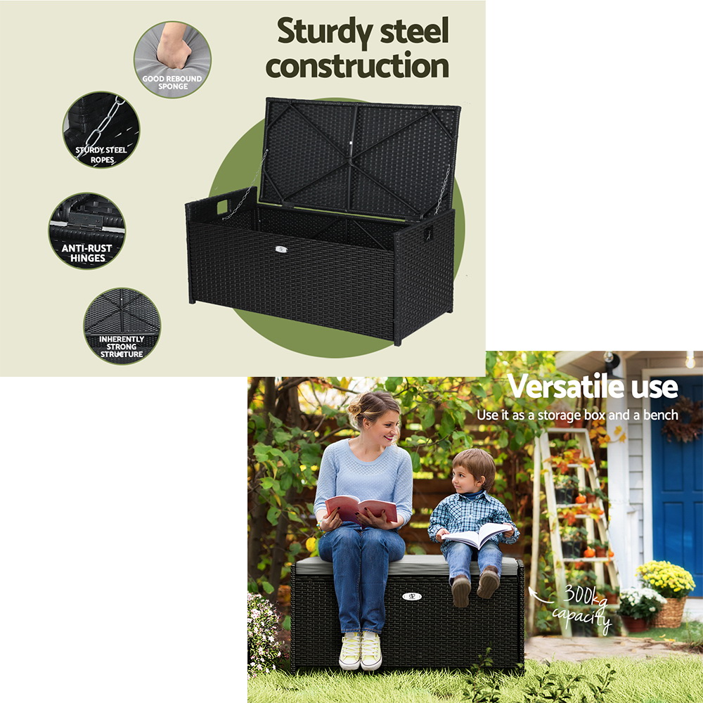 Gardeon Outdoor Storage Bench Box Wicker Garden Sheds Tools Cushion Patio Furniture Black