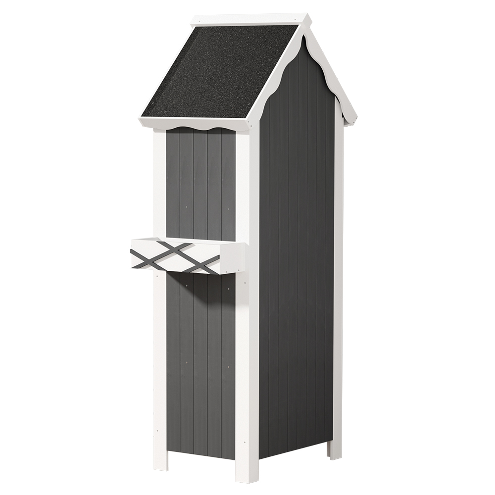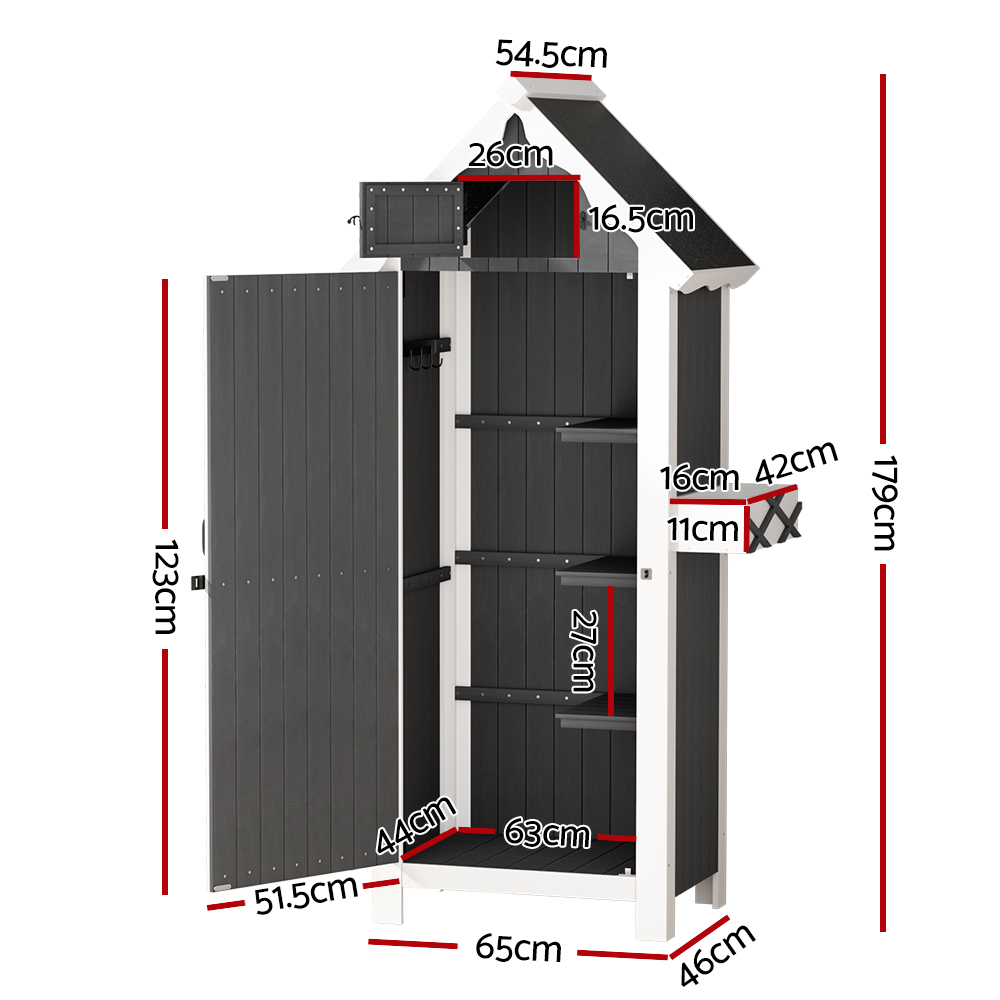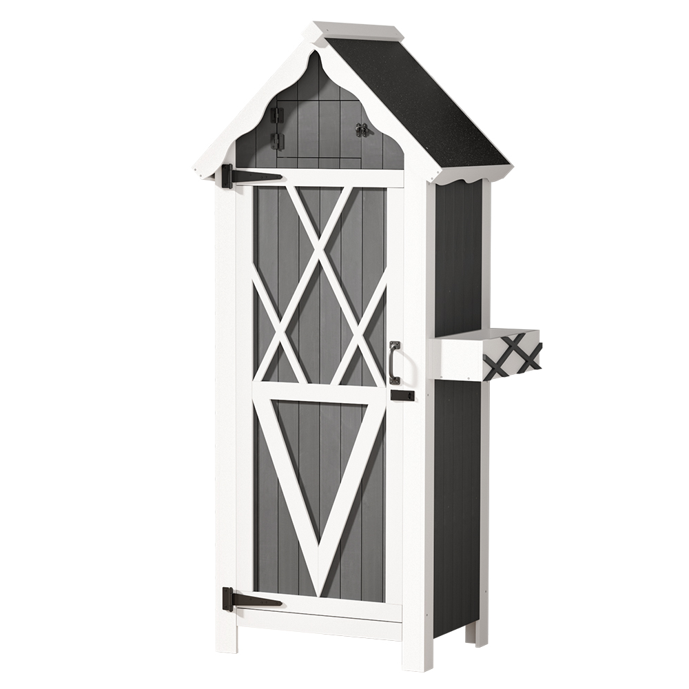 This outdoor storage cabinet offers a stylish and practical solution for garden and outdoor organization. Made from solid Fir wood, it features multiple storage options including three tiers of shelving, three hangers, and an upper compartment. Its weather-resistant design and water-resistant asphalt roof ensure durability in various weather conditions. The lockable door with magnetic latch provides security for stored items, making it suitable for indoor or outdoor use with a rustic aesthetic. Easy to assemble and use, it combines functionality with charming design.
