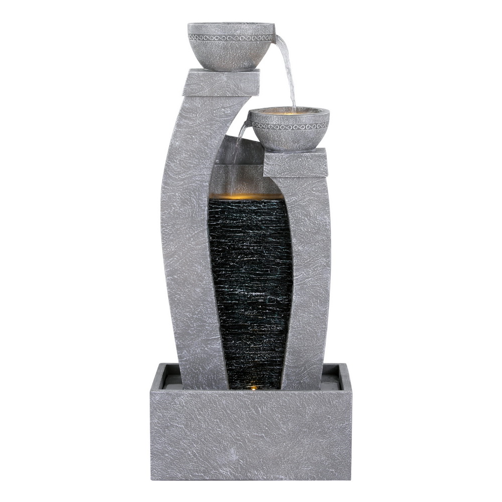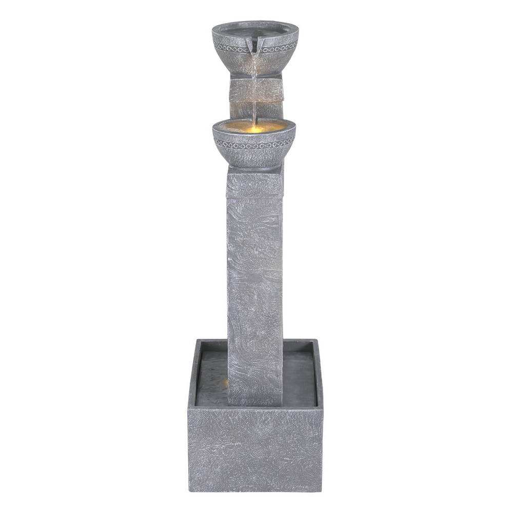 This cascading water feature is designed to enhance both outdoor and indoor spaces with its elegant and calming presence. Made from durable polyresin with detailed sculptural elements, it creates soothing water sounds and adds aesthetic appeal to gardens, balconies, patios, or living areas. Powered by a solar panel and equipped with a rechargeable battery, it operates efficiently using sunlight and can run during overcast weather or at night. The fountain includes a water pump that provides a gentle flow, making it a charming and low-maintenance decorative piece.