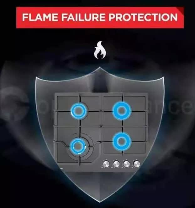 This gas glass cooktop features a sleek black glass surface with four burners, providing efficient cooking options. It includes a natural gas regulator, LPG regulator and nipples, and cast iron pan supports for durability. The cooktop is equipped with automatic electronic ignition and a flame failure device for safety. It offers a triple ring wok burner, semi-rapid burner, and auxiliary burner to meet various cooking needs.