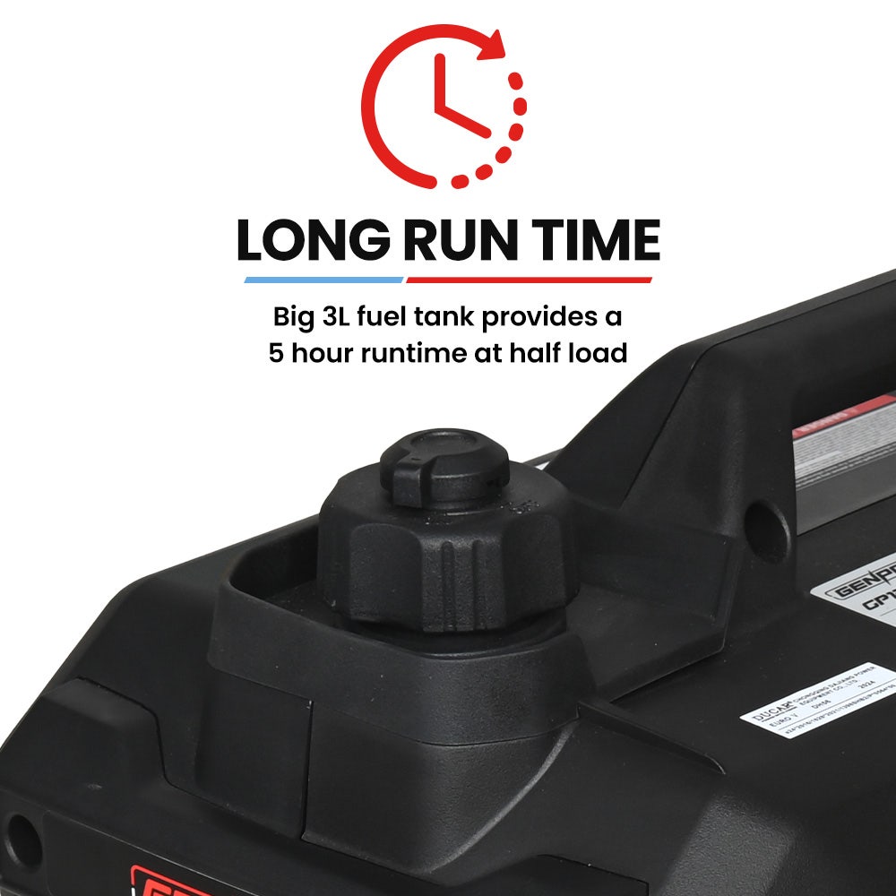 • Up to 5 hours of runtime at 50% load with a 3-litre fuel tank