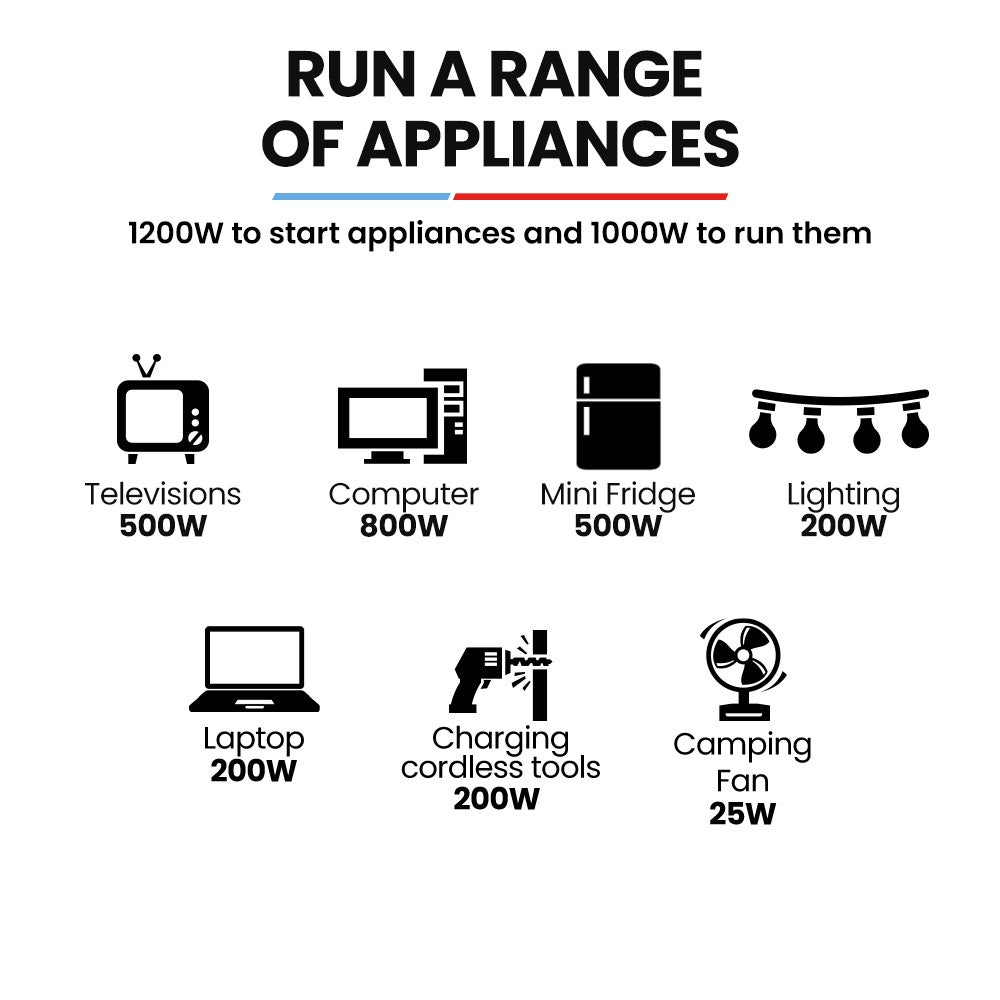 • Peak starting power of 1200W and continuous output of 1000W