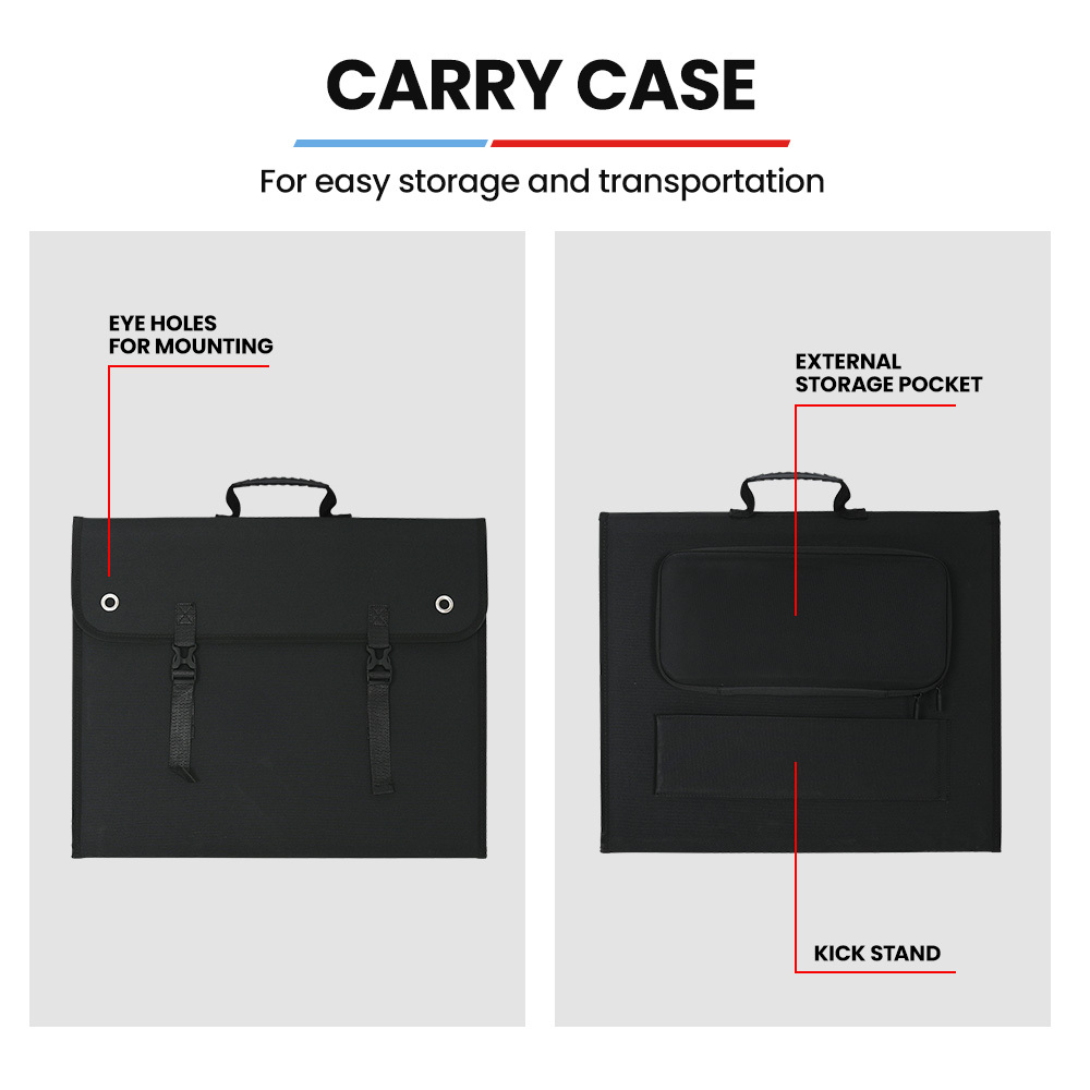 This portable folding solar panel provides a reliable source of clean energy for outdoor activities such as camping, hiking, or outdoor events. It features high-efficiency monocrystalline cells, adjustable kickstands for optimal sun exposure, and a built-in intelligent charge controller to safely transfer power to various batteries and devices. Compact and lightweight, it is designed for easy transport and convenient use in outdoor environments.