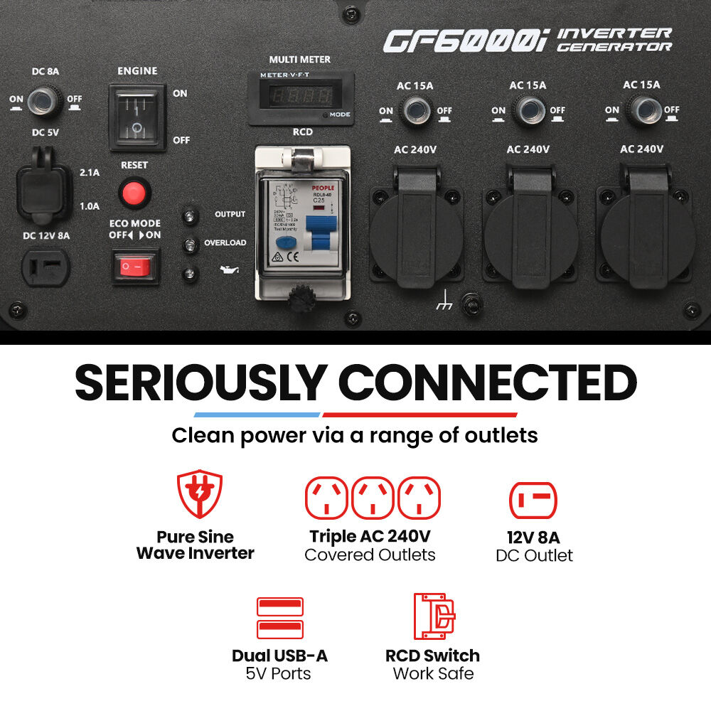 GENPOWER 6kW Peak 5kW Open Frame Inverter Generator, 3x15A, 15L Tank, Wheels, RCD, Portable, Backup
