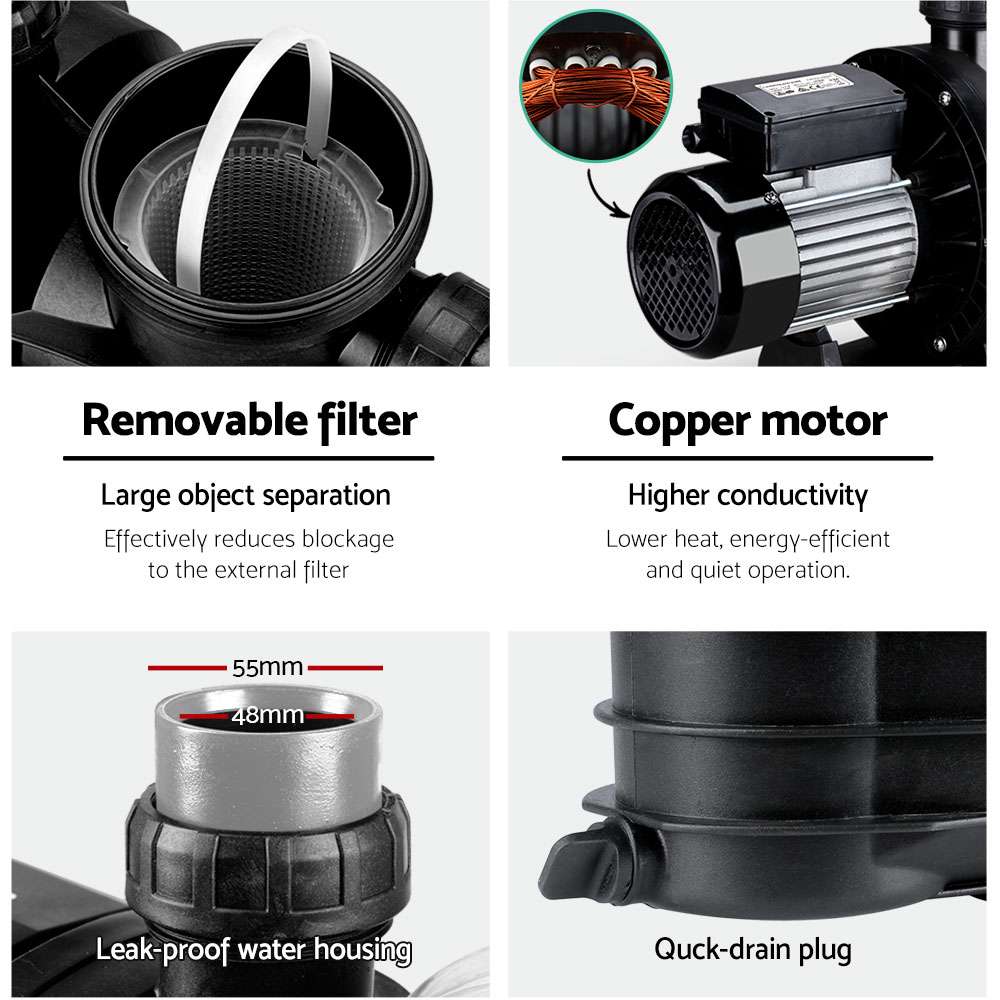 This swimming pool water pump is designed to handle both salt water and chlorine-filtered pools. It features a corrosion-resistant marine-grade cast iron motor housing and a chemical-resistant thermoplastic filter and cartridge tank body, ensuring durability and long-lasting performance. The pump includes an integrated filtration basket to capture fine debris, providing efficient cleaning for your pool.