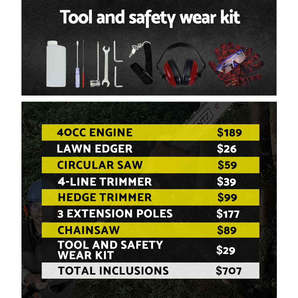 This versatile gardening tool set includes a powerful chainsaw and multiple attachments designed for various cutting tasks. The equipment features a robust engine, easy operation, and quick-change attachments, making it suitable for professional and home gardening projects. The set also provides additional extension poles for reaching difficult areas and comes with safety gear and tools for a complete experience.