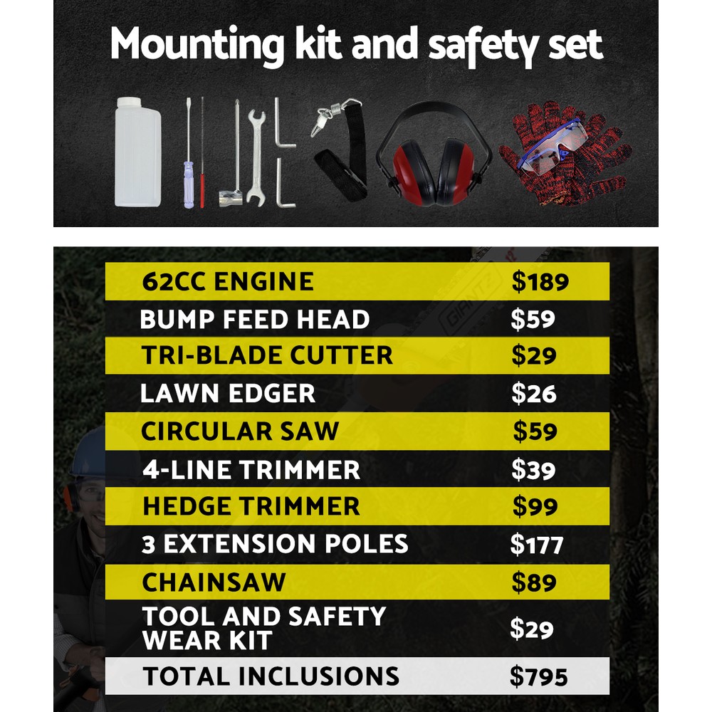 Package contents include the pole chainsaw, three extension poles, hedge trimmer, two whipper snippers, five brushcutters, fuel mix tank, shoulder strap, toolkit, manual, gloves, glasses, and earmuffs.
