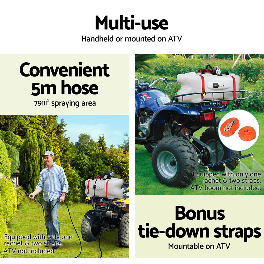 This weed sprayer features a large capacity tank and a powerful self-priming pump, making weed and pest control tasks easier and more efficient. It is designed for versatile use, suitable for mounting on various vehicles and equipment, and includes multiple spraying options for broad or spot treatment.