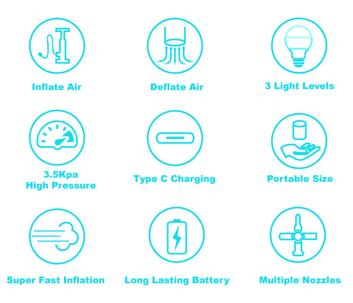 - Quickly inflates inflatables such as air mattresses, swimming tubes, and pool floats