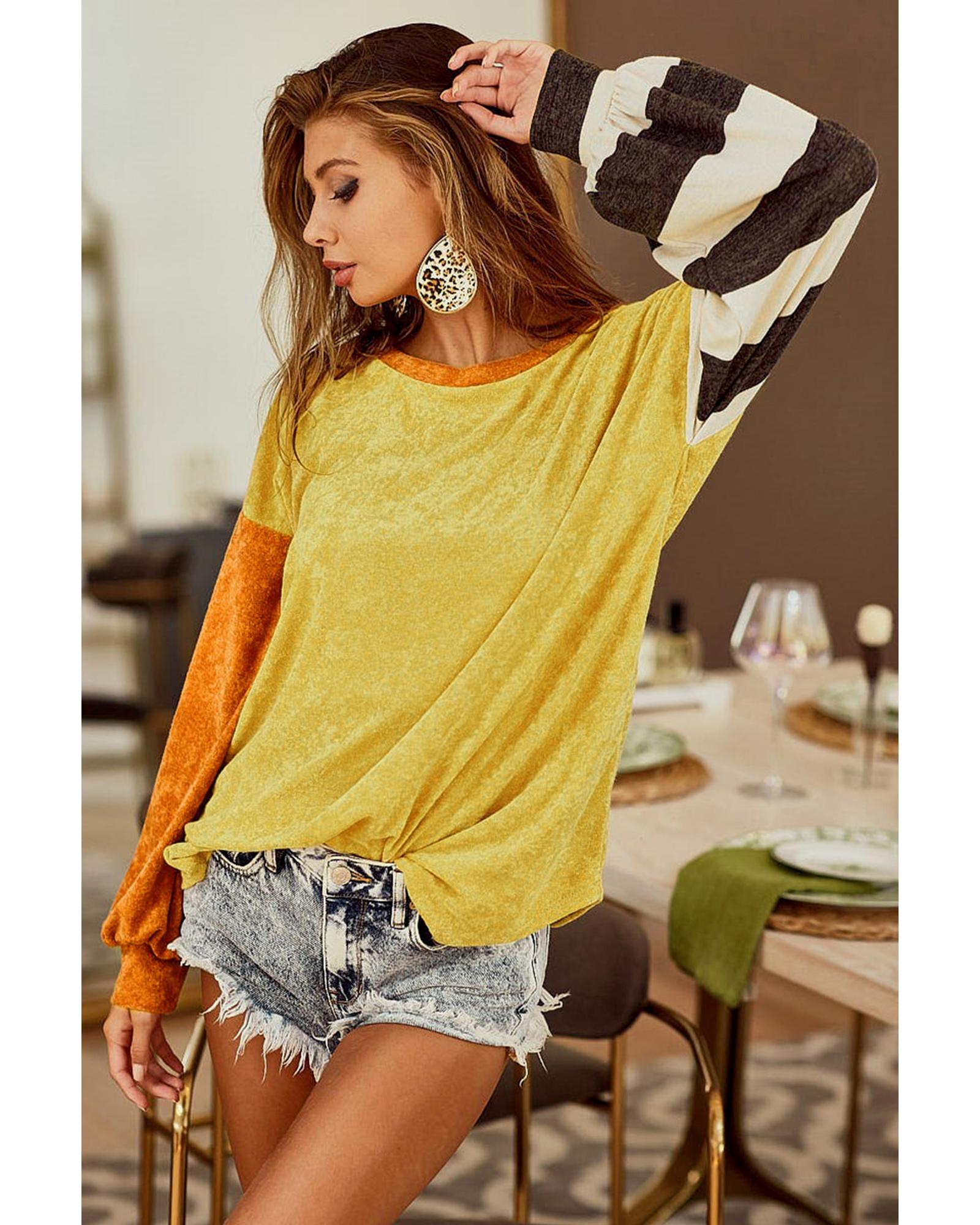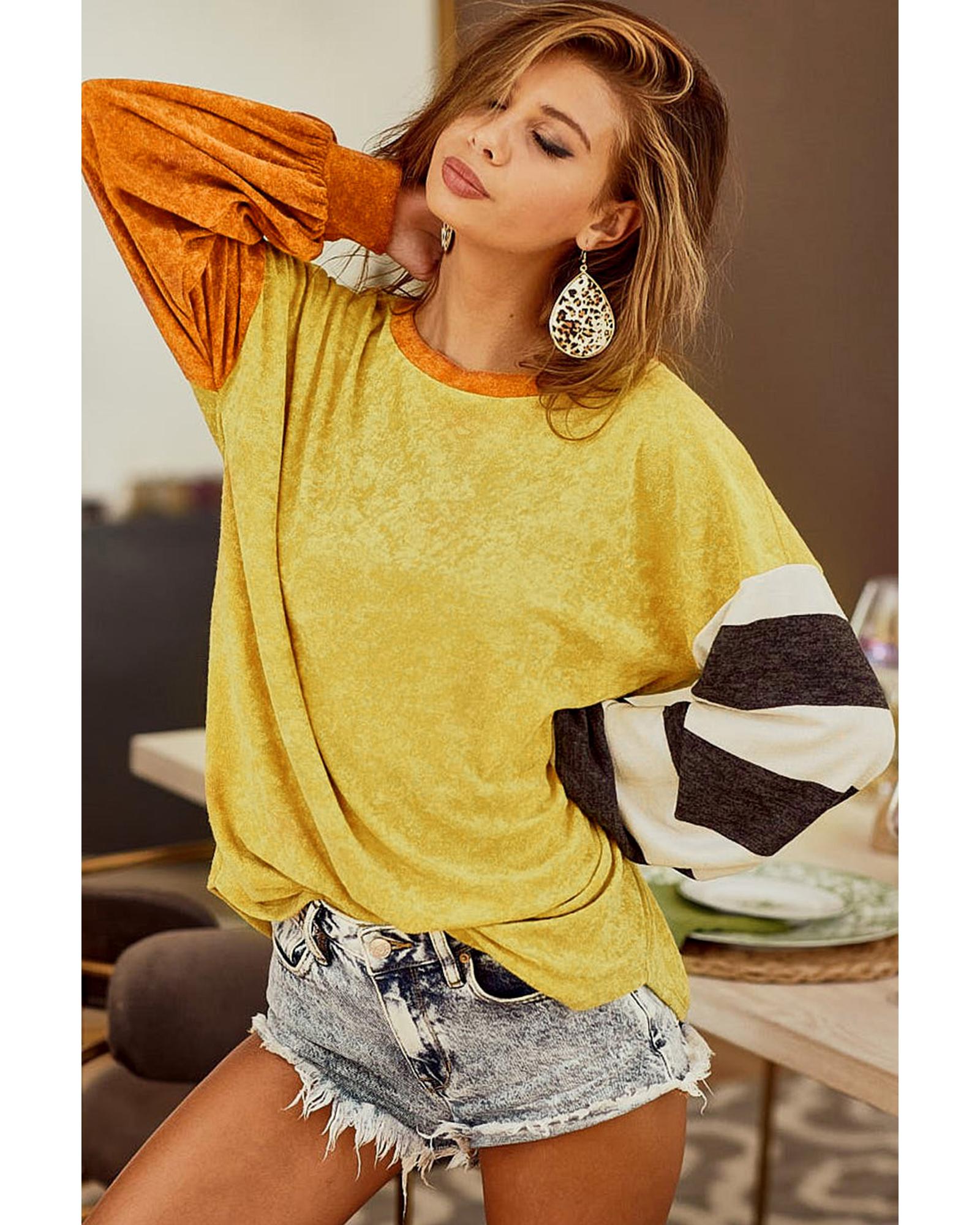 This top features a trendy colorblock and striped sleeve design with patchwork details, offering a stylish and versatile look. Its drop shoulder silhouette adds a relaxed fit, making it suitable for various casual occasions. Crafted from high-quality materials, it combines comfort with fashion-forward elements.
