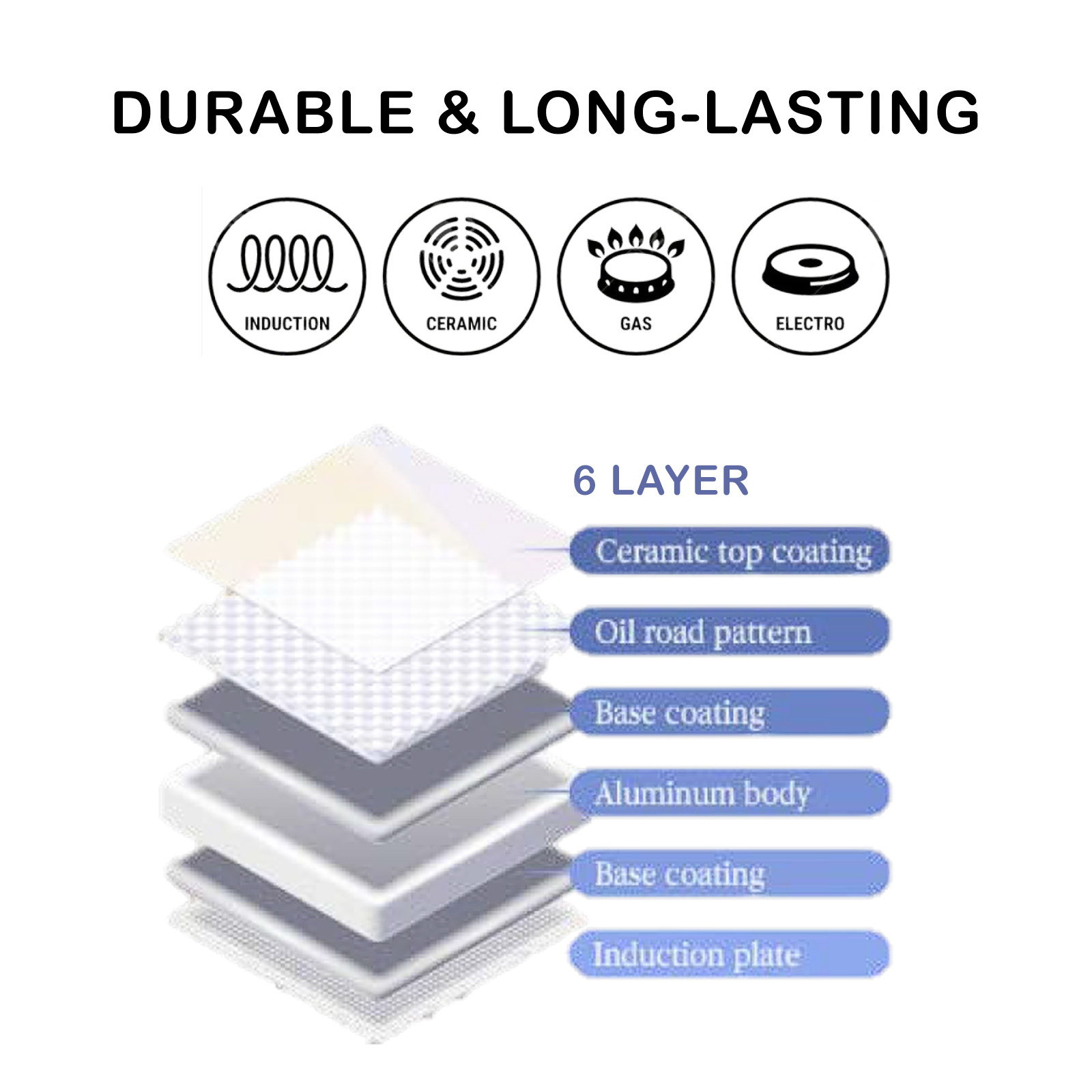 This 28cm ceramic non-stick frying pan features innovative Korean technology with an oil-road pattern layer that ensures even oil distribution, promoting healthier cooking and reducing excess oil use. Its vibrant color adds a stylish touch to your kitchen, while its versatile design makes it suitable for all types of stoves, including induction. The non-stick ceramic coating allows for easy cleaning and efficient cooking, complemented by a comfortable, unhot handle for ease of use.