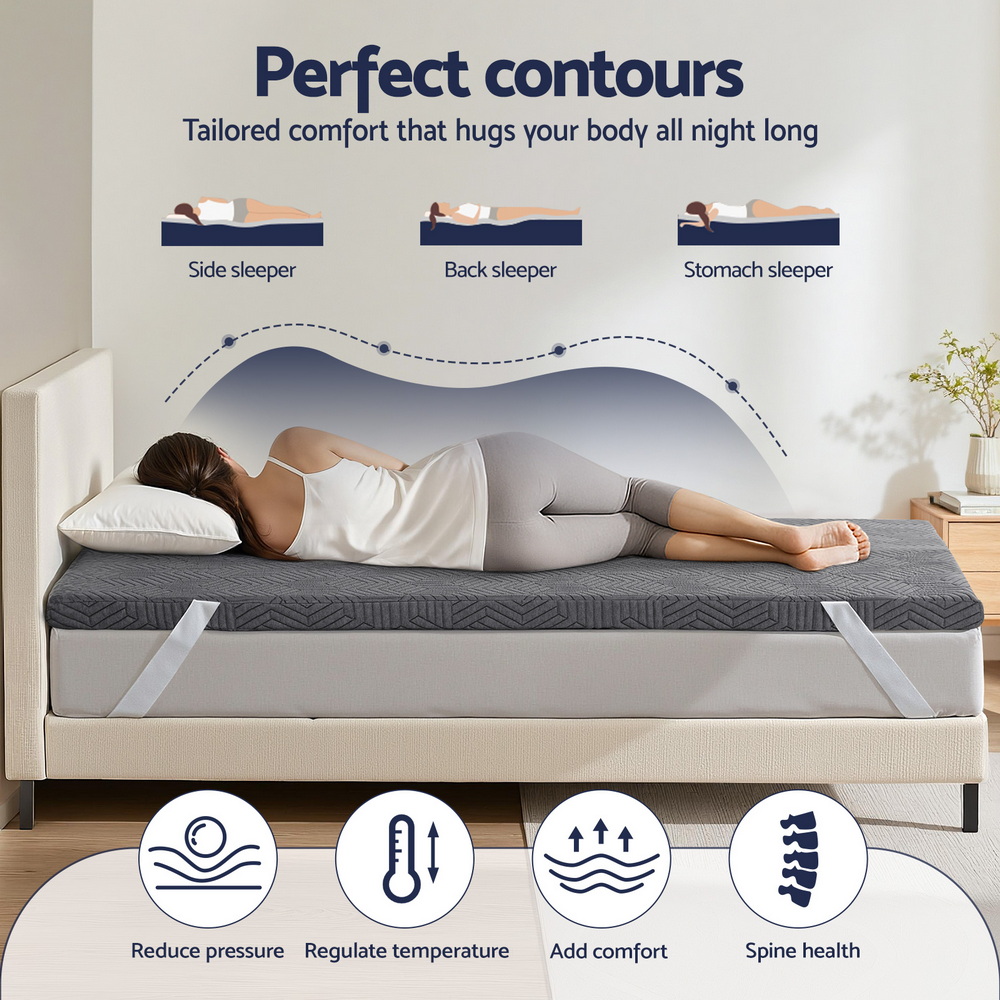 This mattress topper provides a comfortable and supportive sleeping surface with an 8cm thickness. It features a dual-layer gel memory foam design combined with a high-density support base, offering pressure relief and motion isolation. The breathable bamboo cover is removable, washable, and designed to stay securely in place during use.