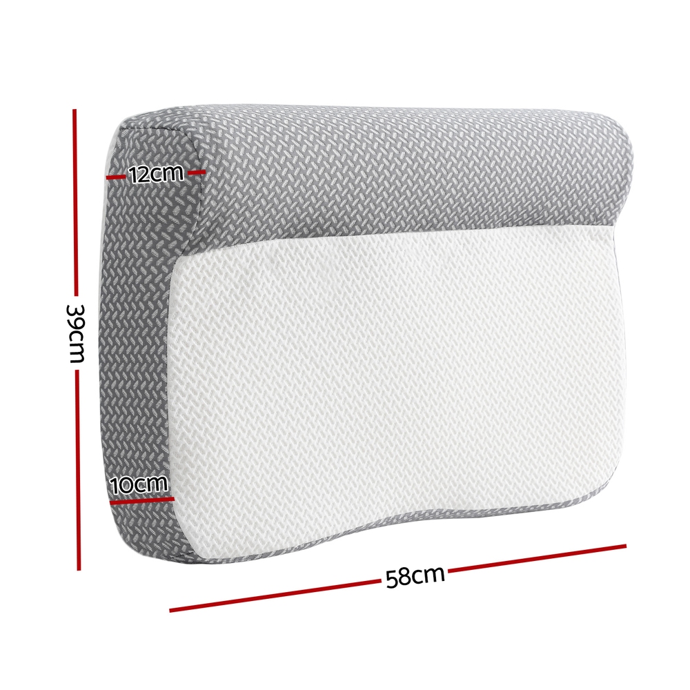 This pillow is designed to provide optimal neck and shoulder support with an ergonomic contour shape. It features memory foam fillings for a plush and comfortable feel. The surface is made of a soft jacquard knit fabric, and the pillow has variable height ends to accommodate different sleep preferences. It also includes a removable, washable cover for easy maintenance.
