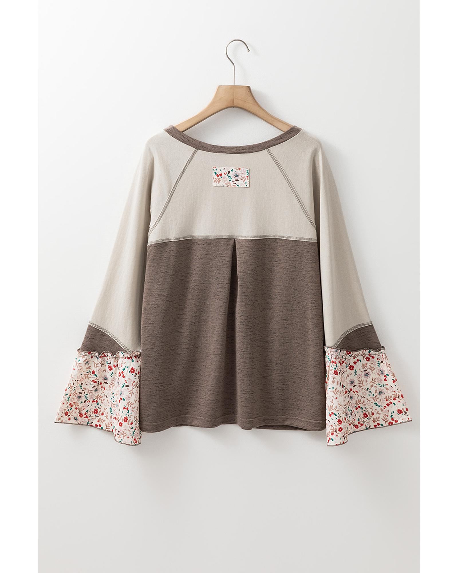 This top features a trendy color block and floral patchwork design with a classic half button Henley front closure. It has a raglan style with exaggerated bell sleeves, offering a fashionable and comfortable fit suitable for various occasions.