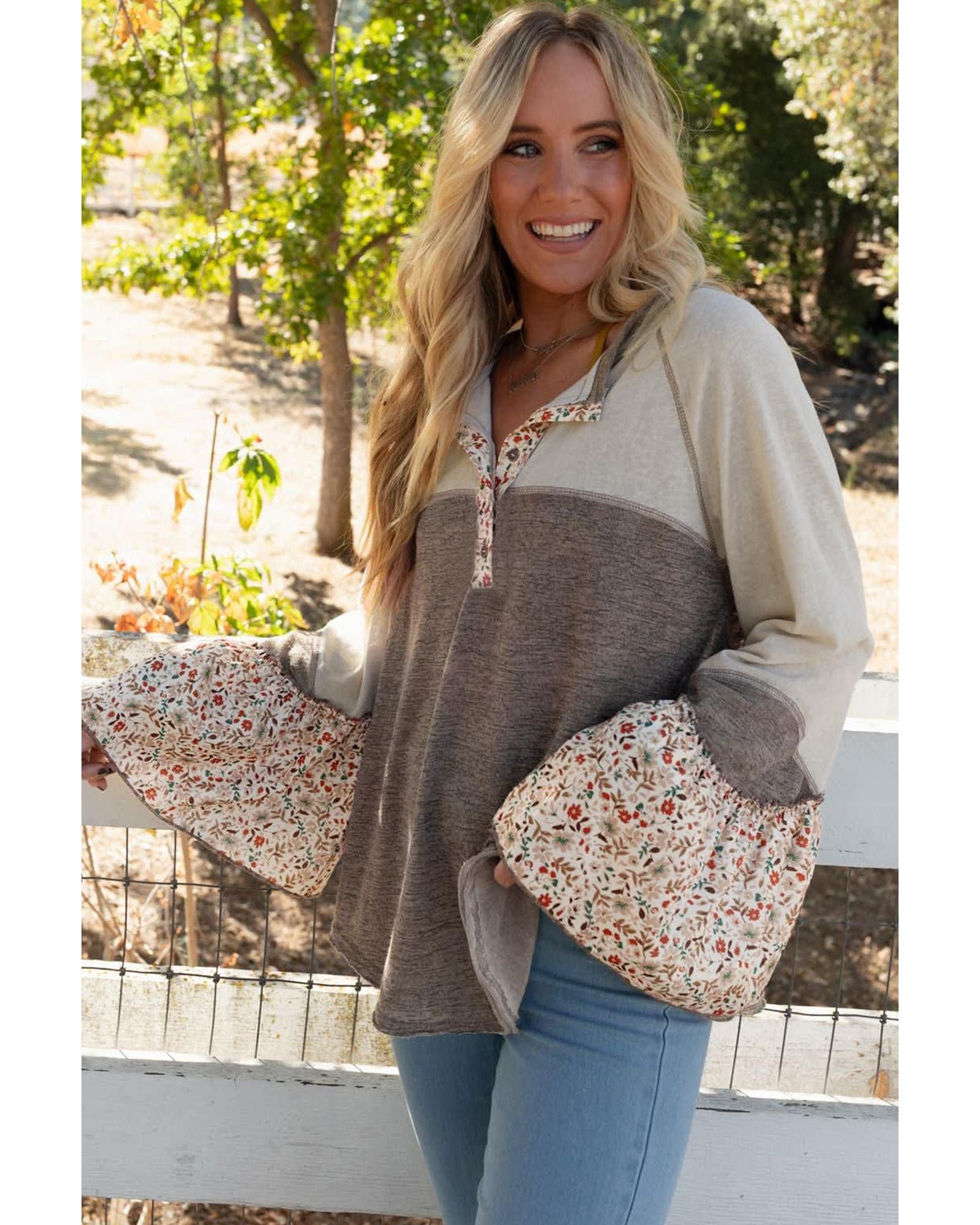 Goat Colorblock Floral Patchwork Flared Sleeve Buttons Henley Top – M