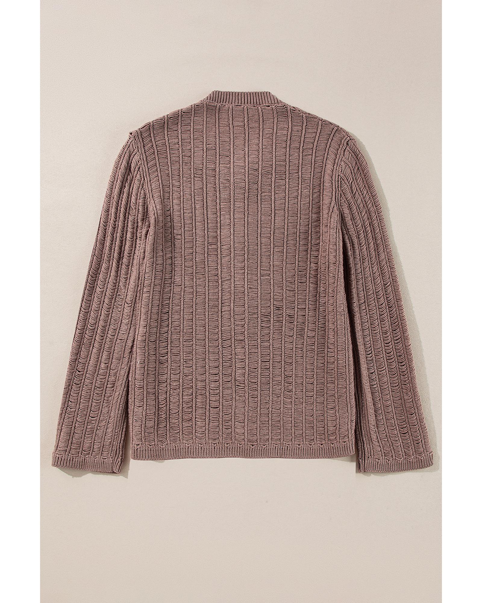 This textured knit cardigan features a unique cut and a buttoned front, offering a modern and versatile addition to your wardrobe. Designed with a trendy fitted look, it provides both comfort and style, making it suitable for various outfits and occasions.
