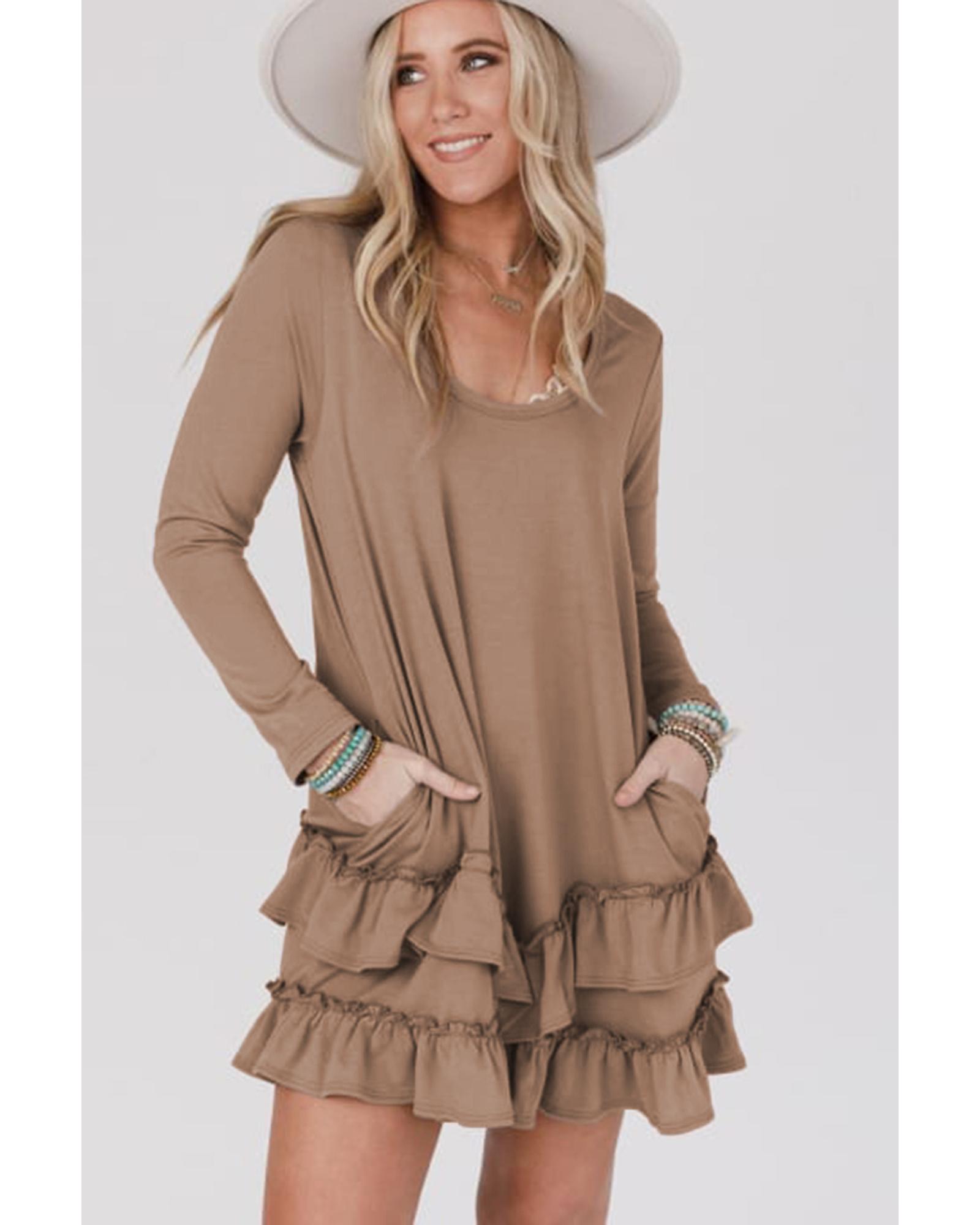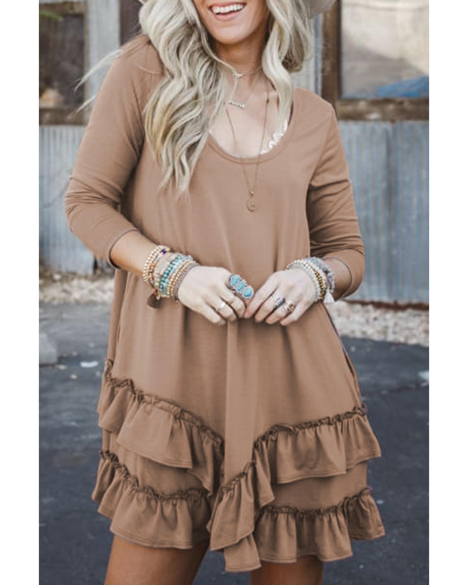 This charming mini dress features a trendy fitted silhouette with a stylish scoop neck and playful tiered ruffled hem. It is designed to be versatile for both casual outings and dressy events, offering a flattering look with practical details such as a side pocket. Available in a variety of chic colors and styles, it combines fashion and comfort effortlessly.