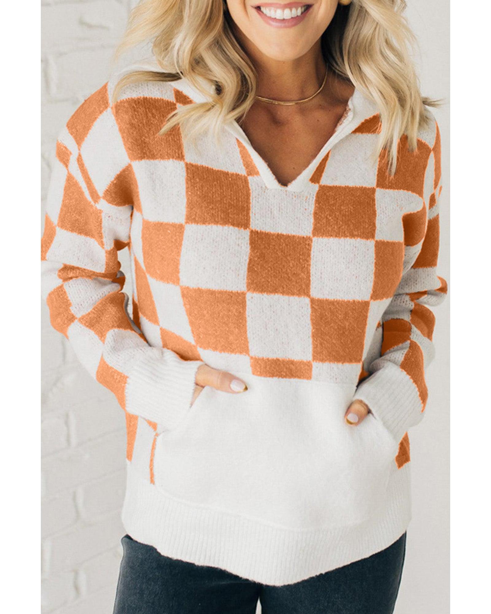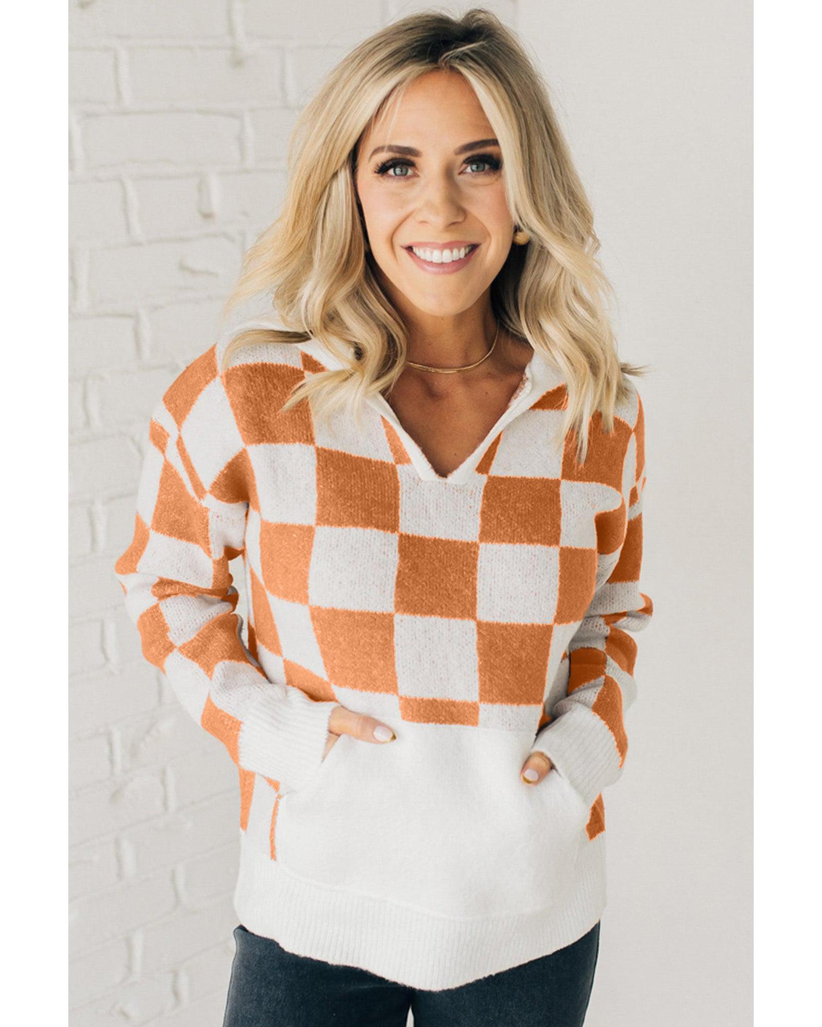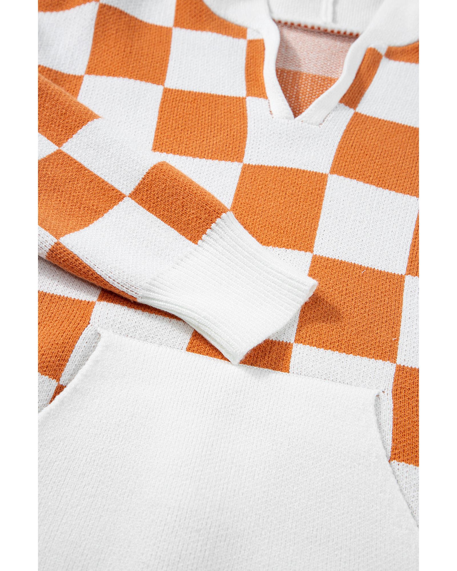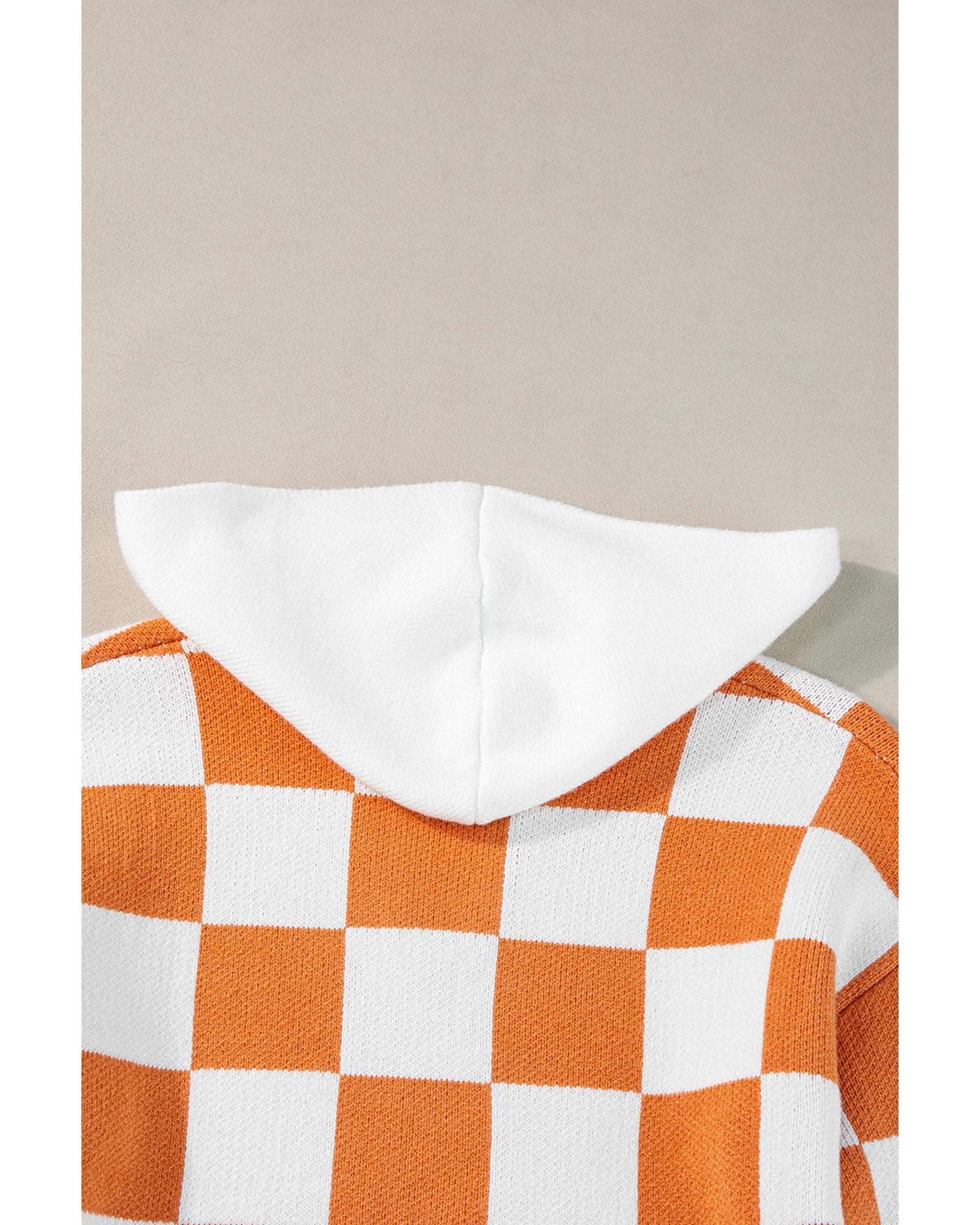 This stylish hooded sweater features a checkered pattern with contrasting details, offering a trendy and comfortable look suitable for winter. It combines functionality with fashion, making it an ideal choice for cooler days or evenings.
