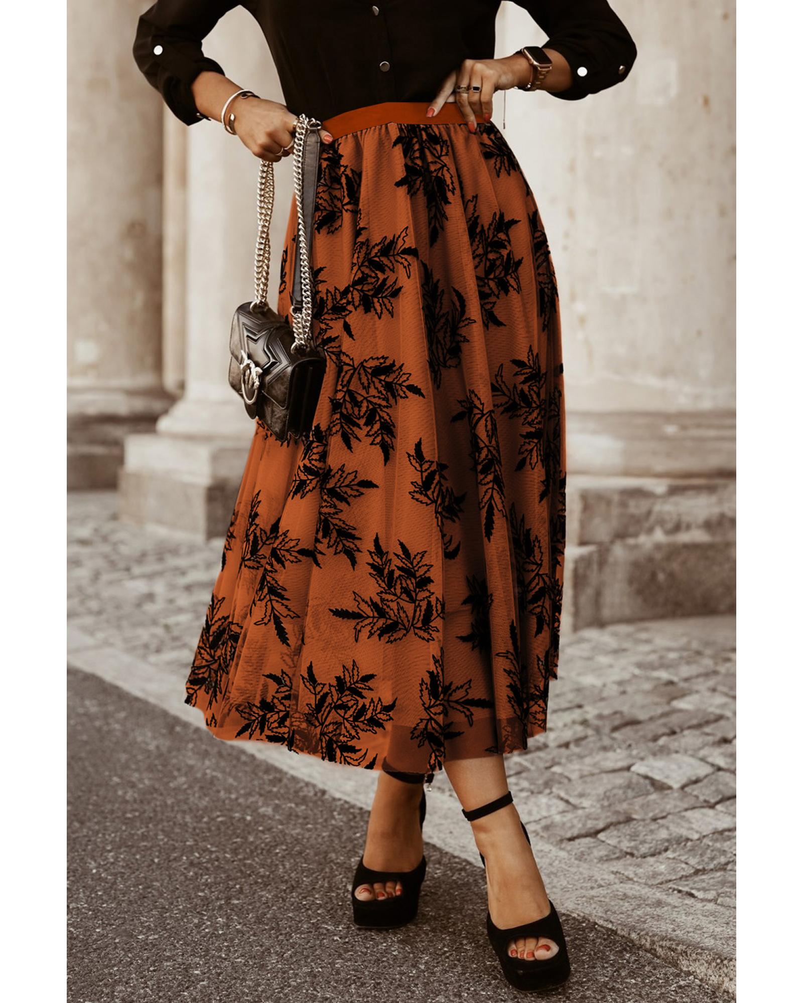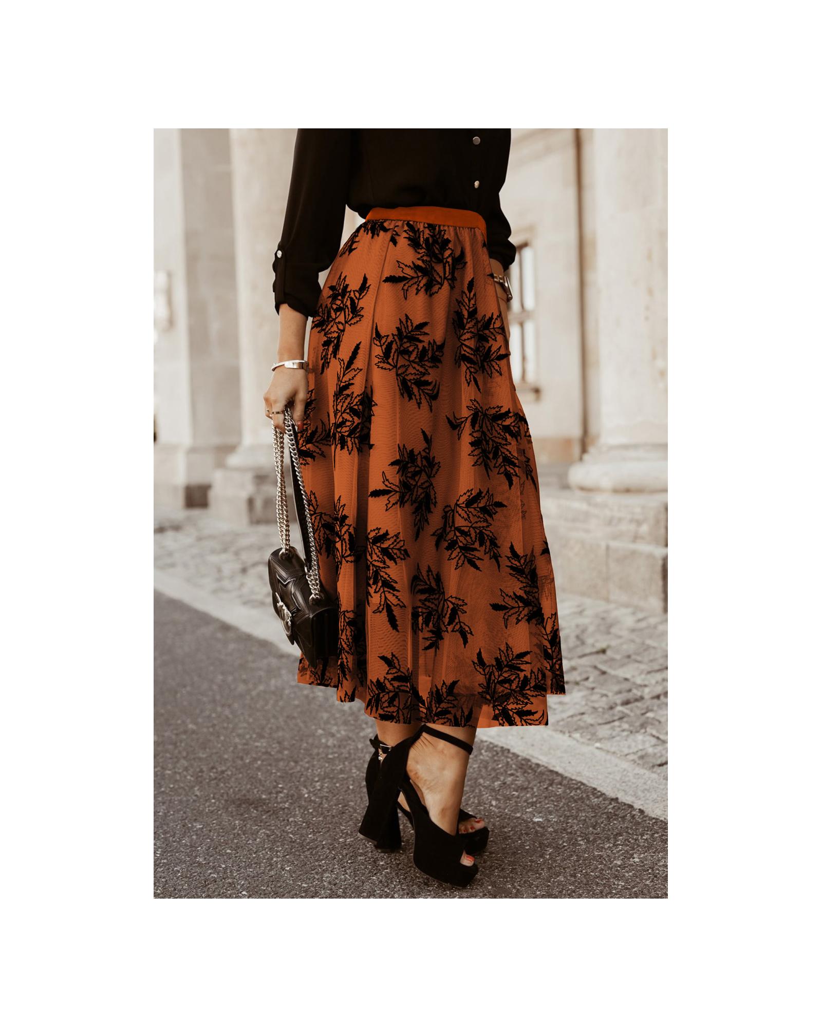 This high waist maxi skirt features an elegant floral and leaves embroidered design, offering a flowy and fashionable look. It is designed to outline a slender waistline and is suitable for various daily occasions, pairing well with shirts, blouses, high heels, boots, and bags.