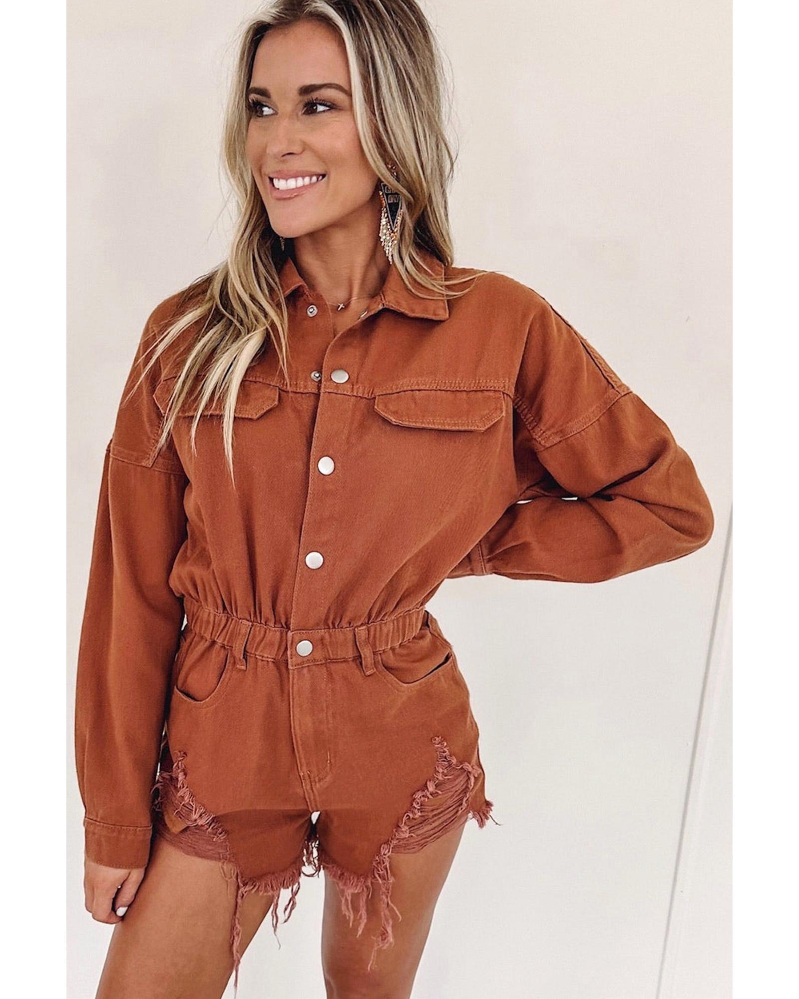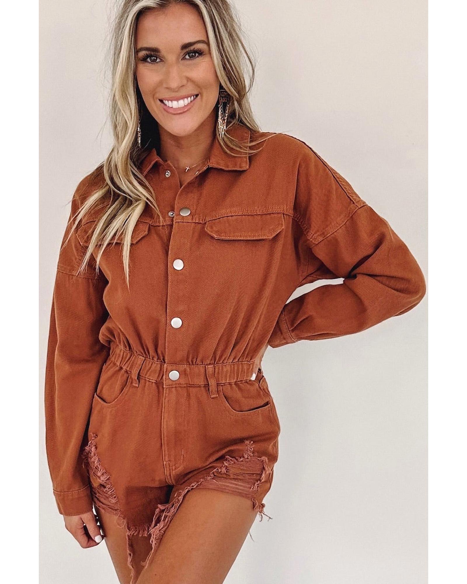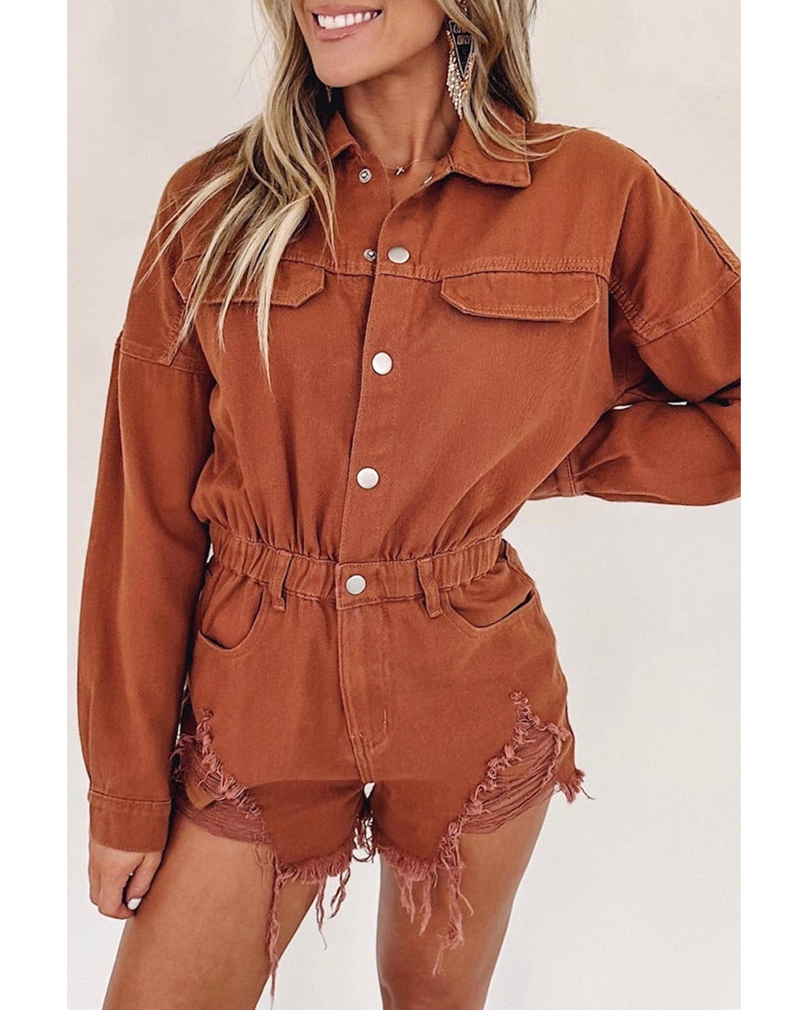 This long sleeve denim romper features a trendy distressed design with snap button closures, offering a stylish and versatile look. Made from durable denim fabric, it combines fashion with comfort, making it suitable for various casual occasions.