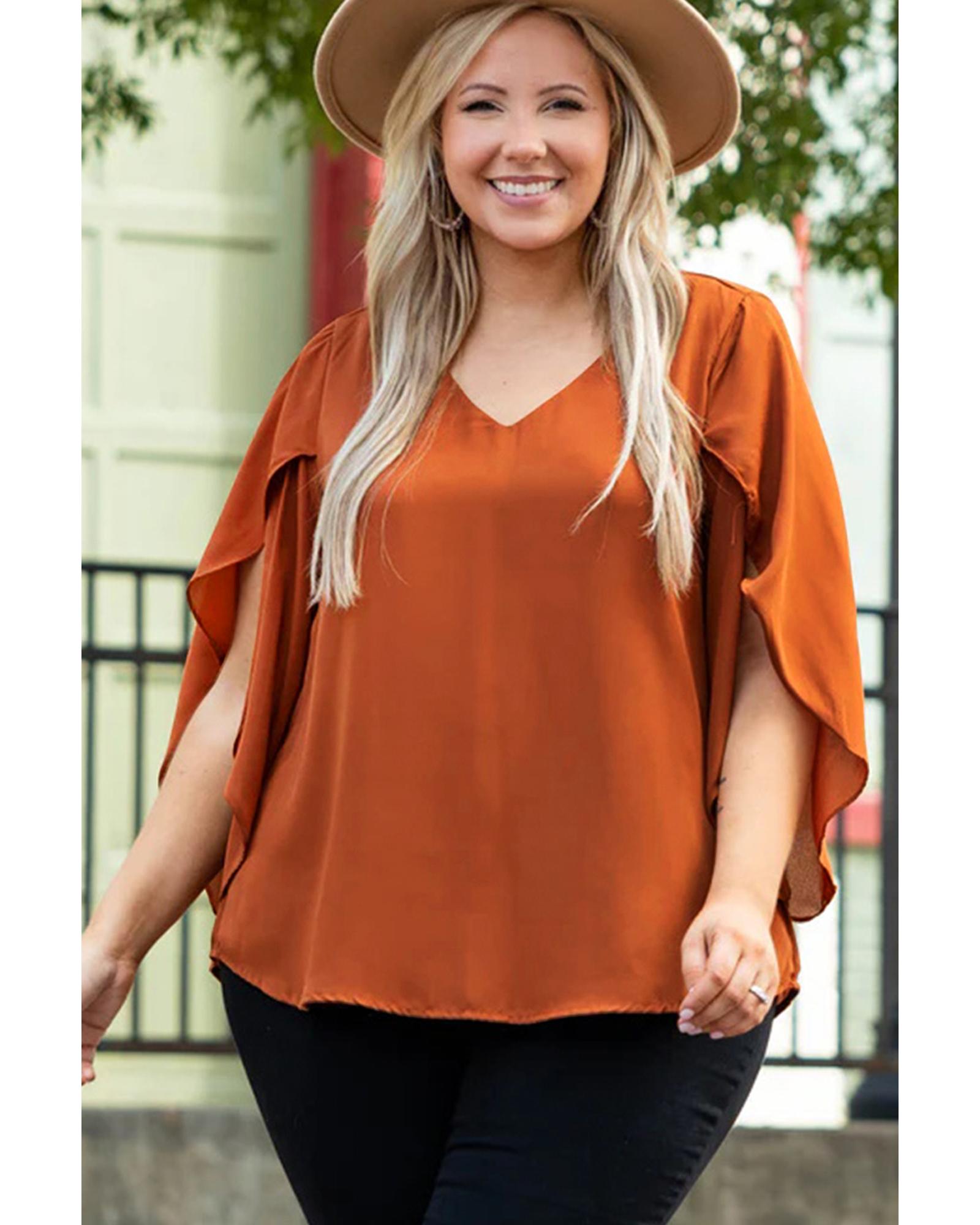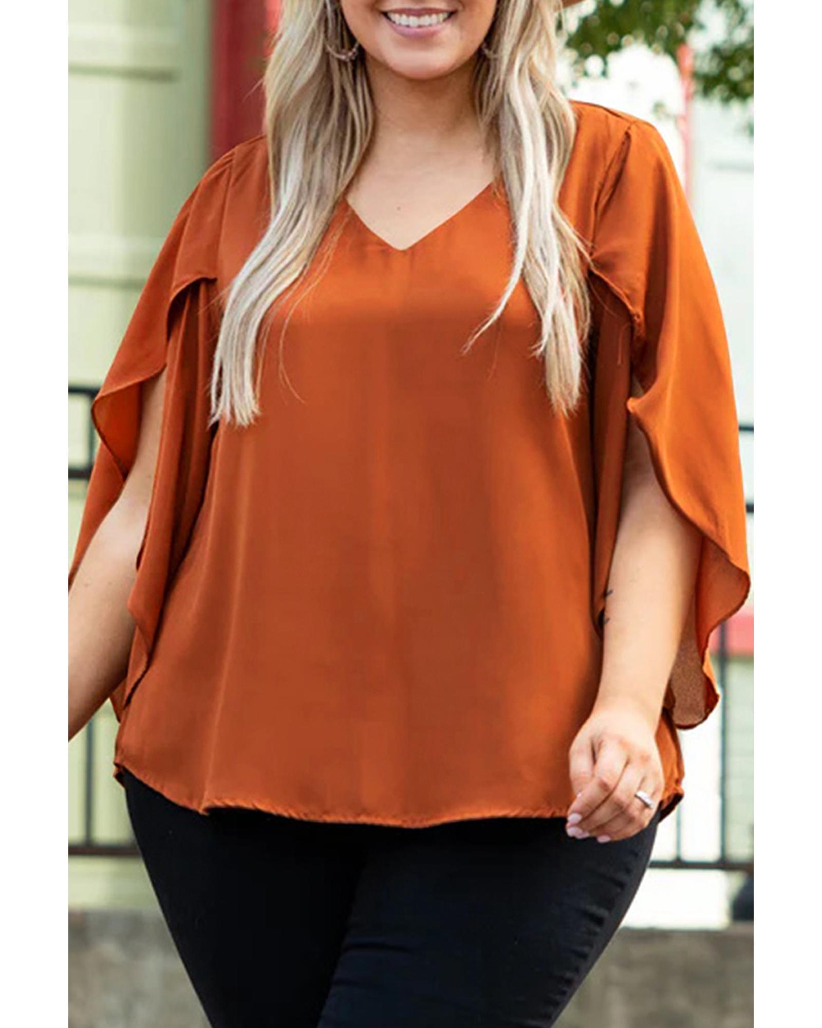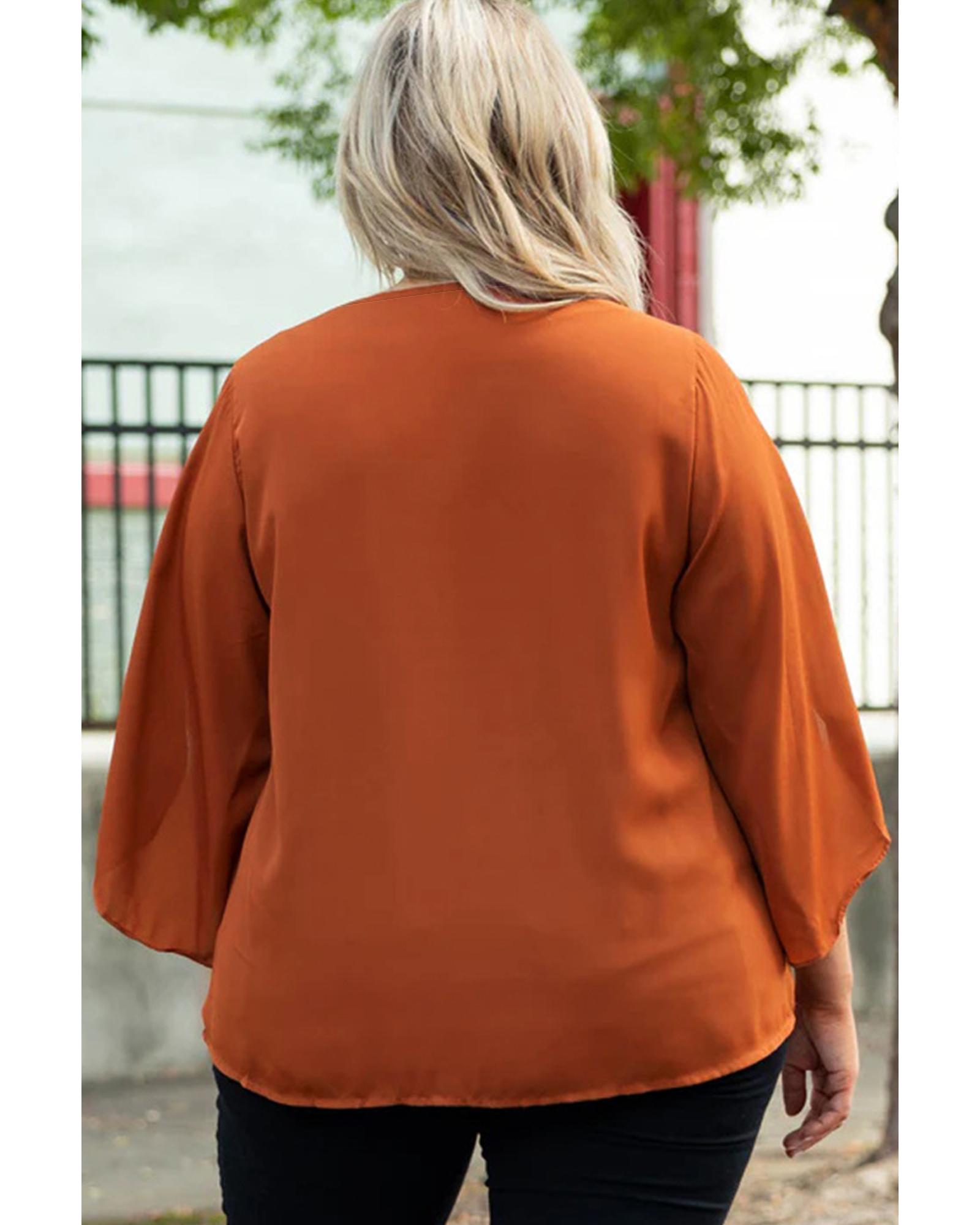 This plus size blouse features a stylish wrapped design with ruffled sleeves and a V-neckline, offering an elegant and versatile look suitable for various occasions. Its flattering silhouette and comfortable fit make it a great addition to any wardrobe.