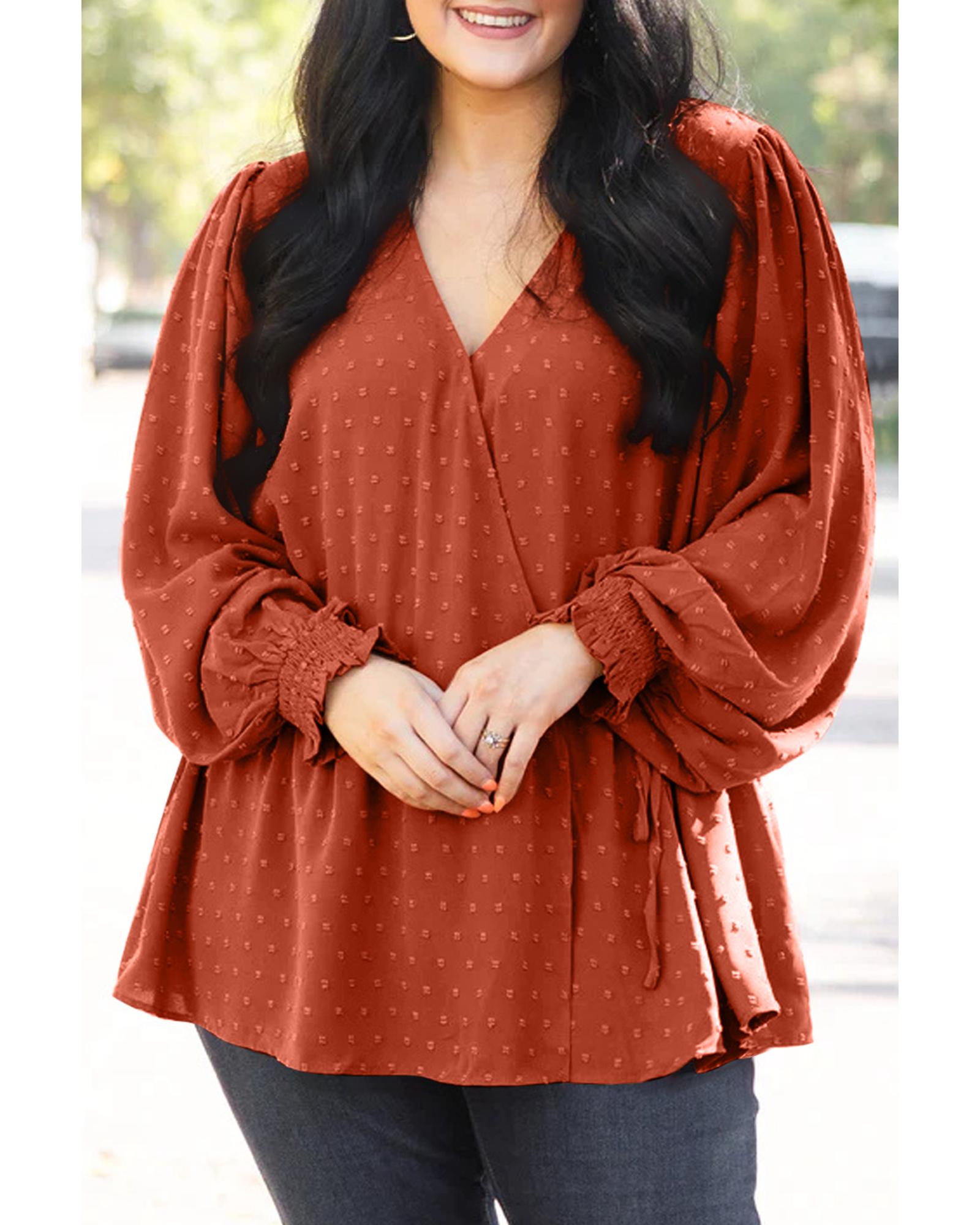 This plus size blouse features a stylish Swiss dot pattern with a V-neck wrap design that creates a flattering silhouette. The side tie detail cinches the waist, enhancing your figure, while puff sleeves add volume to the upper body. Crafted from lightweight polyester, it offers a comfortable fit suitable for various occasions.