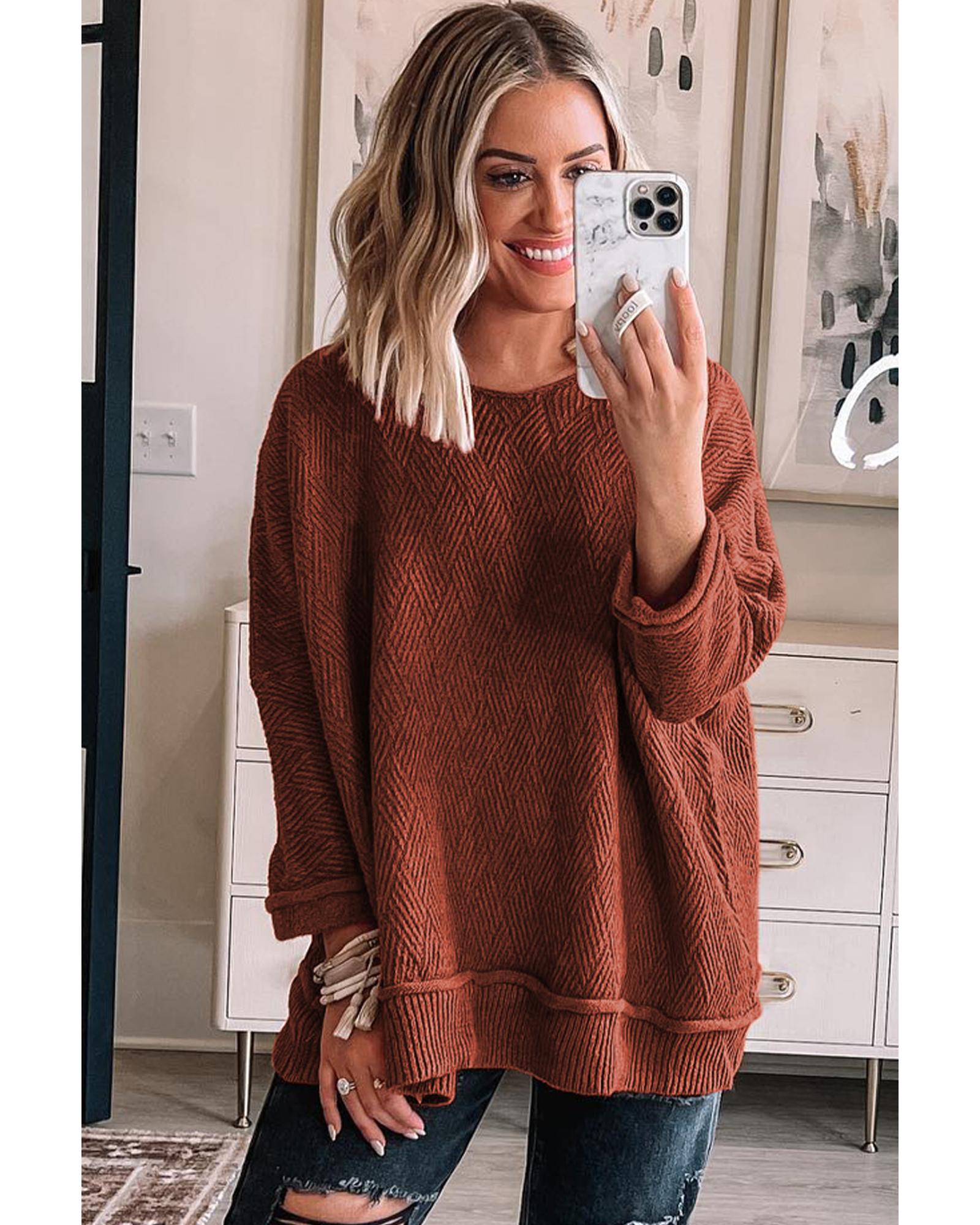 Gold Flame Solid Color Textured Crew Neck Loose Sweater – L