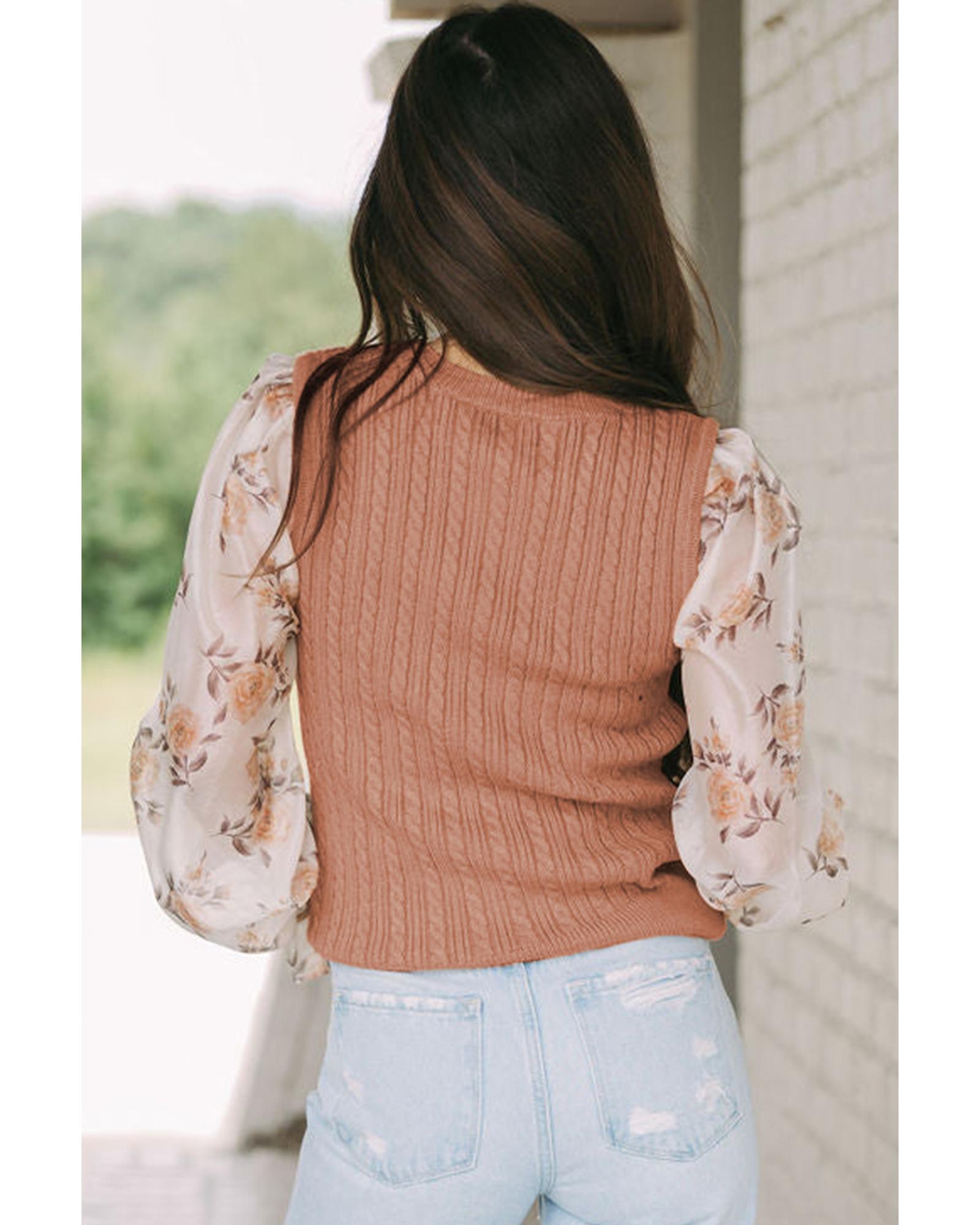 This sweater features a trendy fitted design with a floral patchwork pattern and ruffled cuffs, combining comfort and style for various occasions. Its cable knit construction adds texture and warmth, making it suitable for both casual and formal wear.