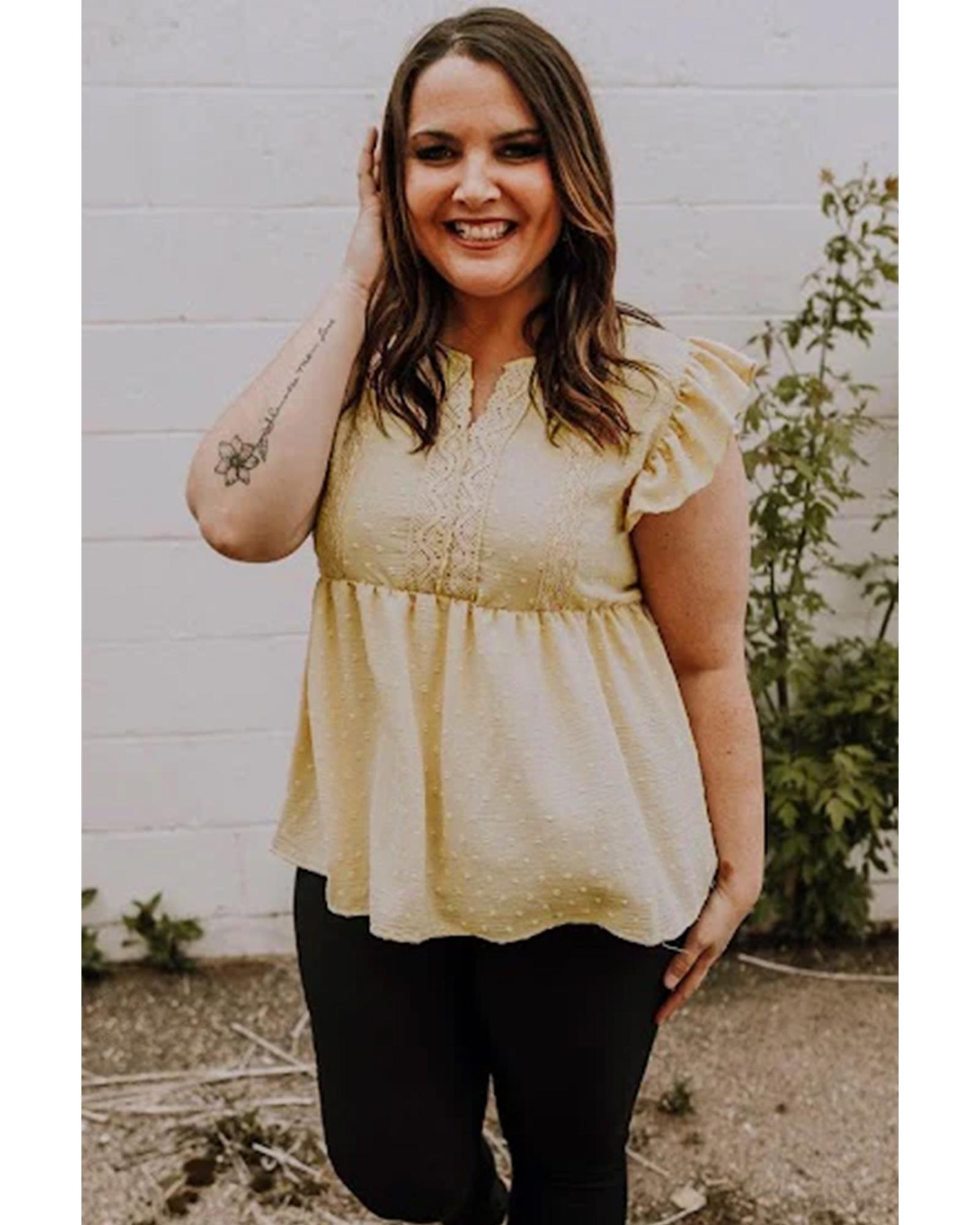 Golden Fleece Plus Size Swiss Dot Lace Trim Split Neck Babydoll Top – 1X