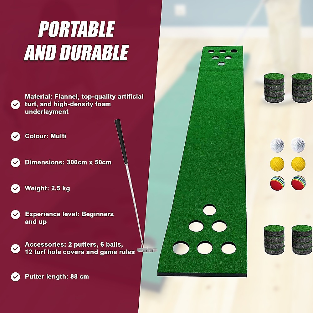 Golf Beer Pong Game Toy Set Green Golf Putting Matt with 2 Putters, 6 Balls