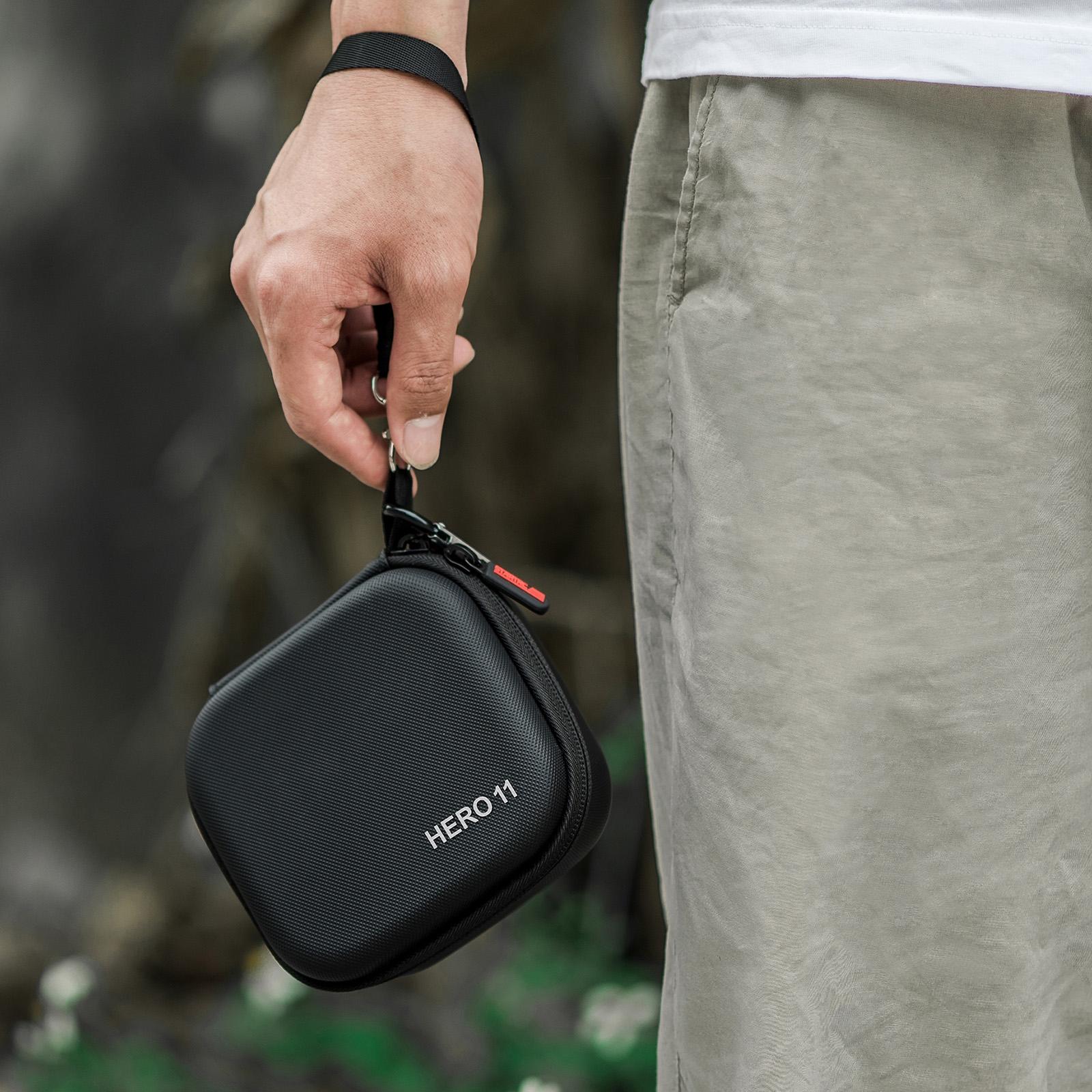 This storage bag is designed to hold a GoPro Hero11 Black and its accessories. It features a protective inner support to safeguard the main device and smaller items. The compact size makes it convenient for travel, easily fitting into backpacks or carried by hand, with an included carabiner for added portability. Made from waterproof and anti-fouling carbon textured PU fabric, it offers reliable protection for your equipment.