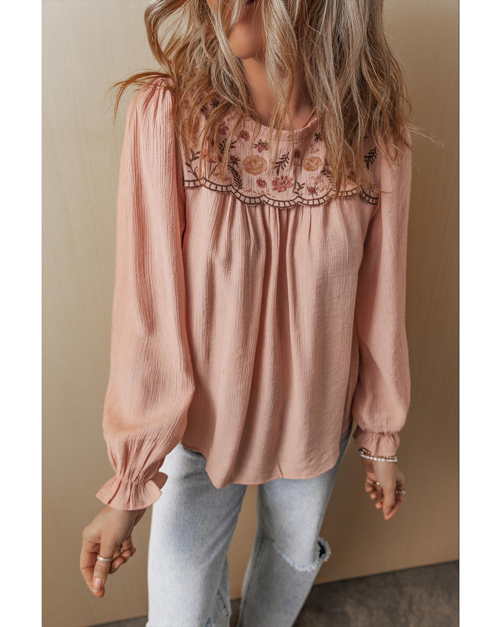 This elegant blouse features a beautiful floral embroidery design and a textured fabric that exudes sophistication. The flounce sleeves add a charming touch, making it suitable for both casual and formal occasions.